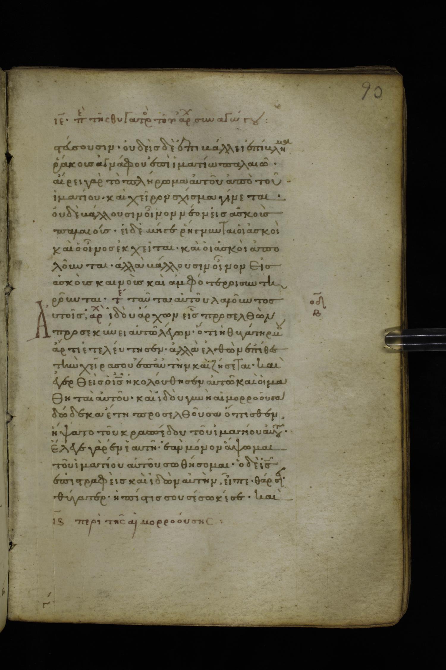 Fourteenth century minuscule of the Gospels on parchment; 282 leaves, 1 column, 22-23 lines per column. Images were taken at the National Library of Greece in Athens.
