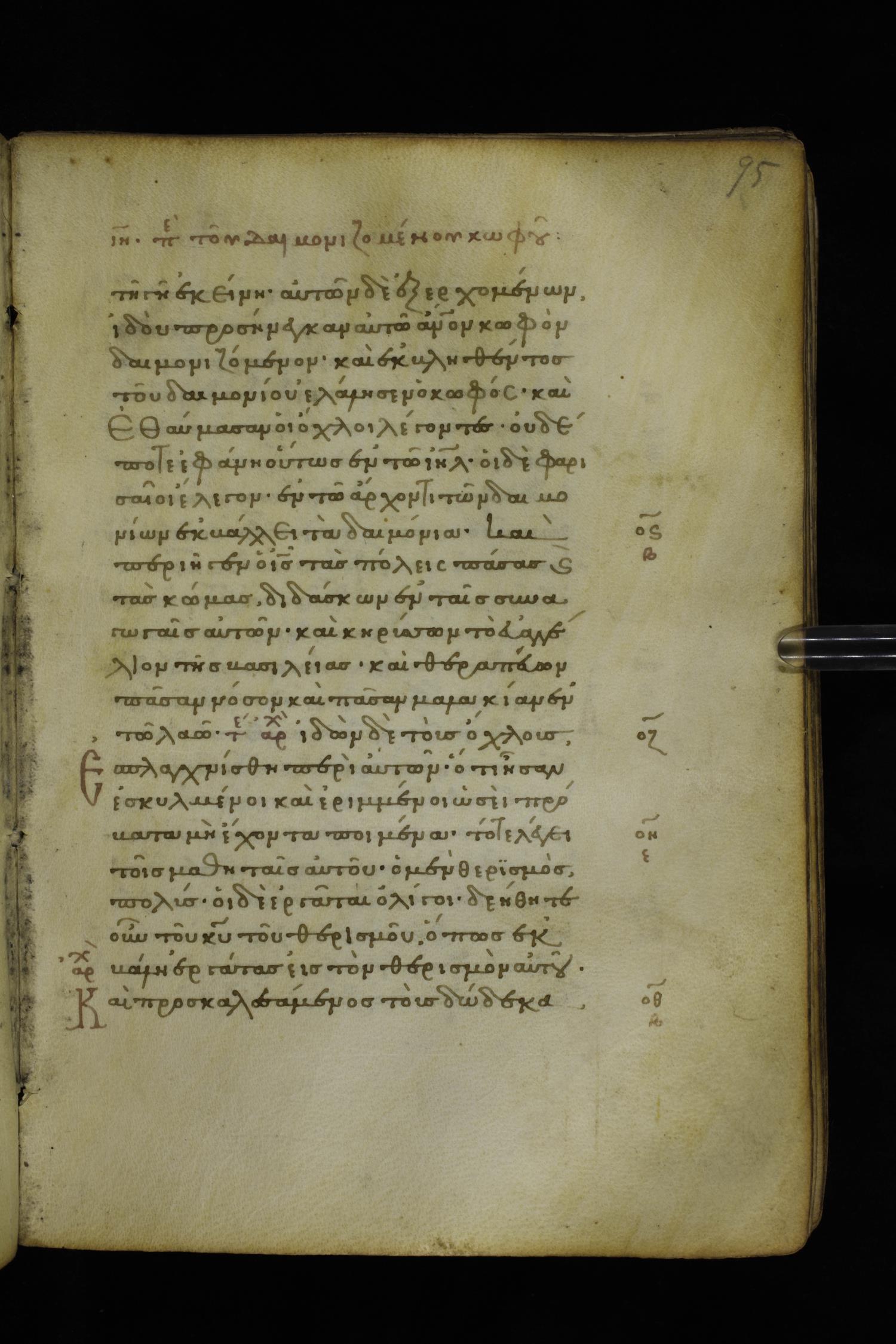Fourteenth century minuscule of the Gospels on parchment; 282 leaves, 1 column, 22-23 lines per column. Images were taken at the National Library of Greece in Athens.