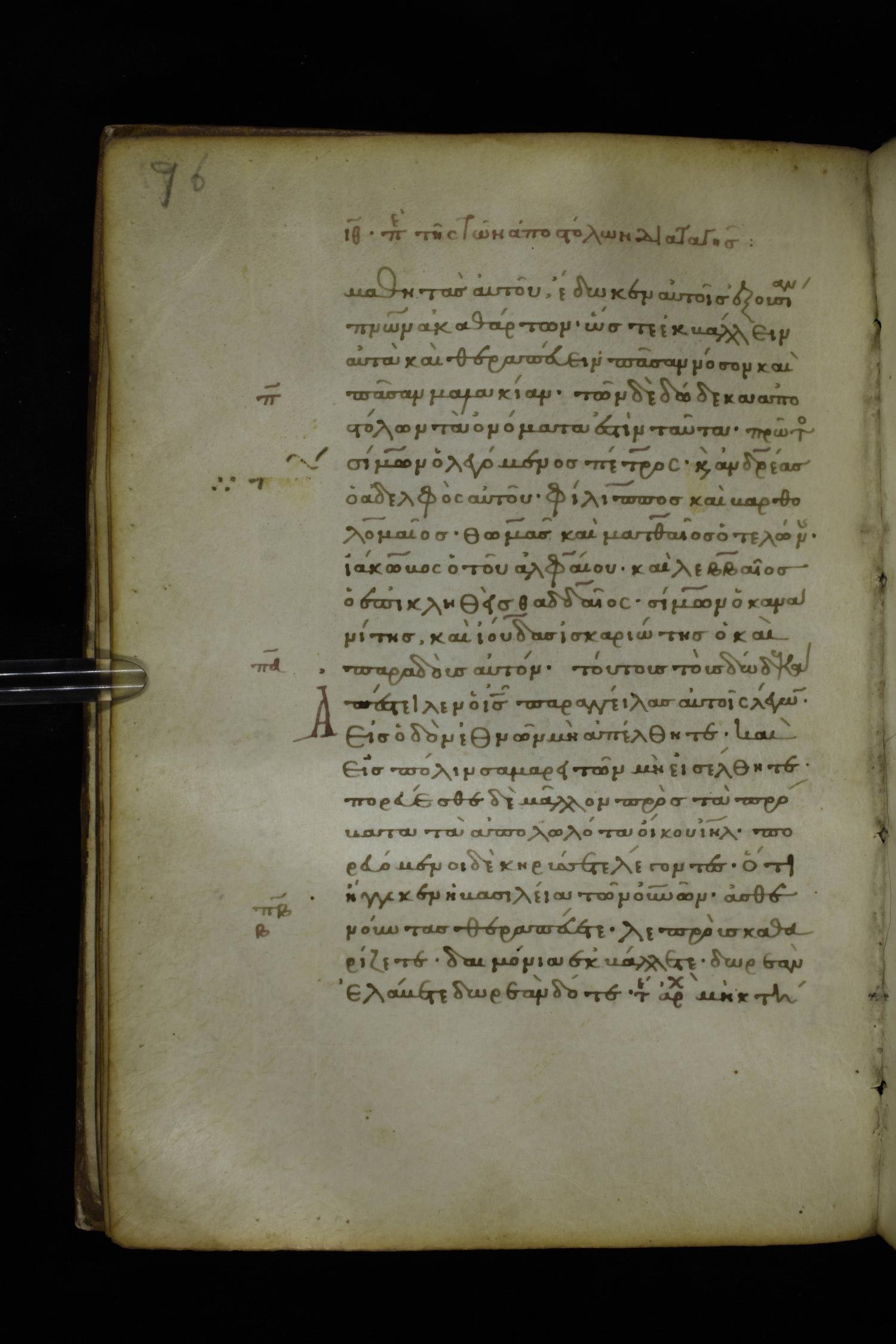 Fourteenth century minuscule of the Gospels on parchment; 282 leaves, 1 column, 22-23 lines per column. Images were taken at the National Library of Greece in Athens.