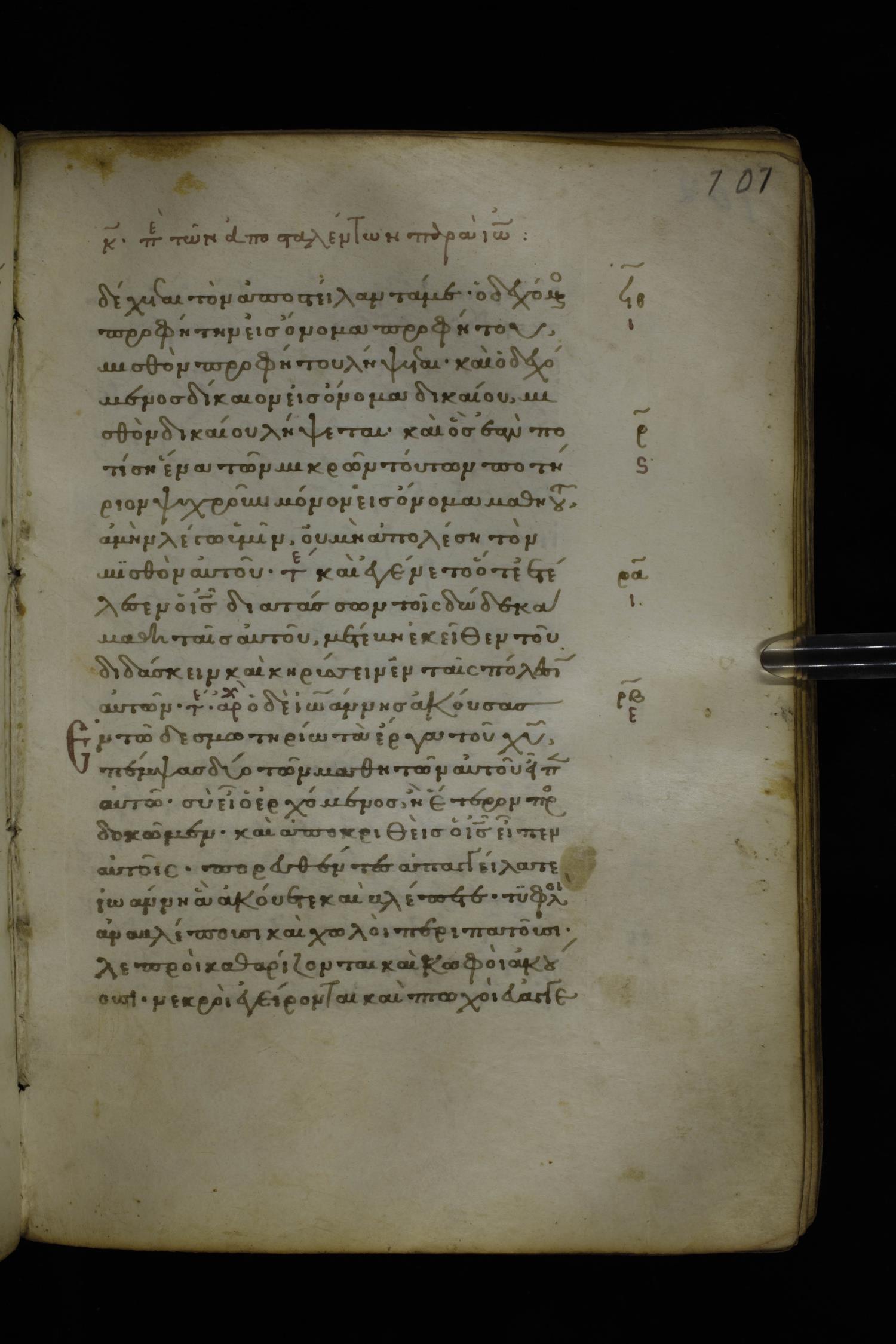 Fourteenth century minuscule of the Gospels on parchment; 282 leaves, 1 column, 22-23 lines per column. Images were taken at the National Library of Greece in Athens.