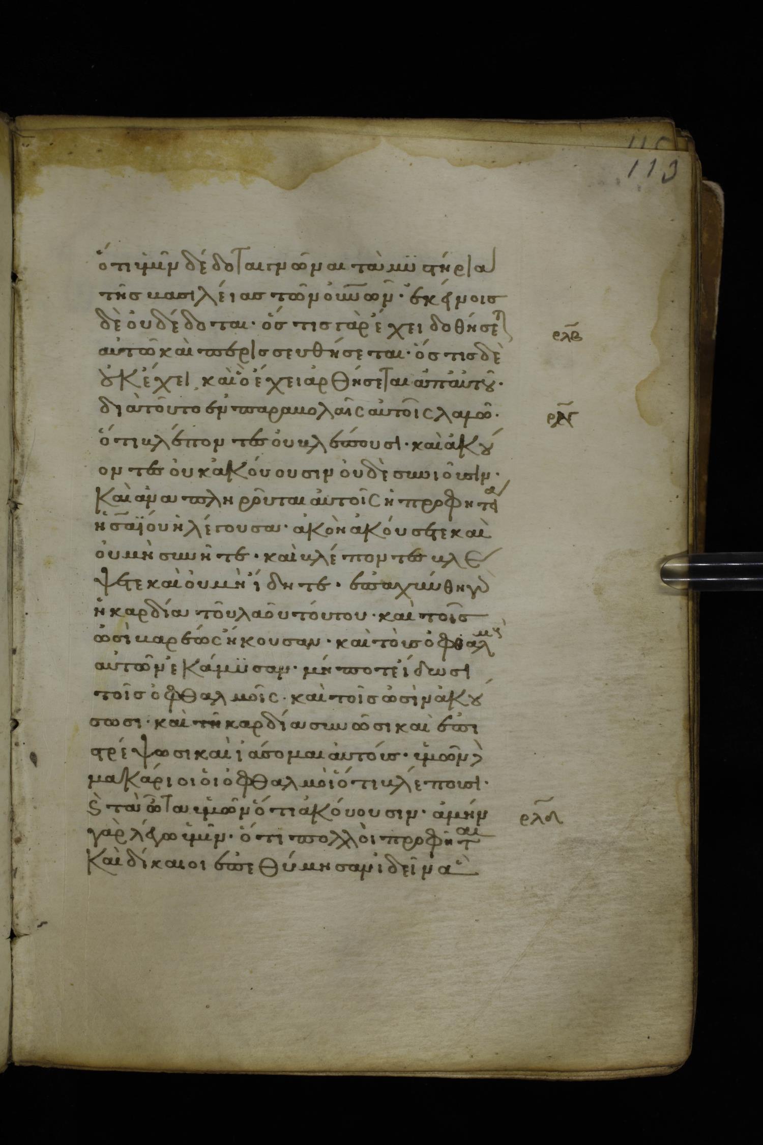 Fourteenth century minuscule of the Gospels on parchment; 282 leaves, 1 column, 22-23 lines per column. Images were taken at the National Library of Greece in Athens.