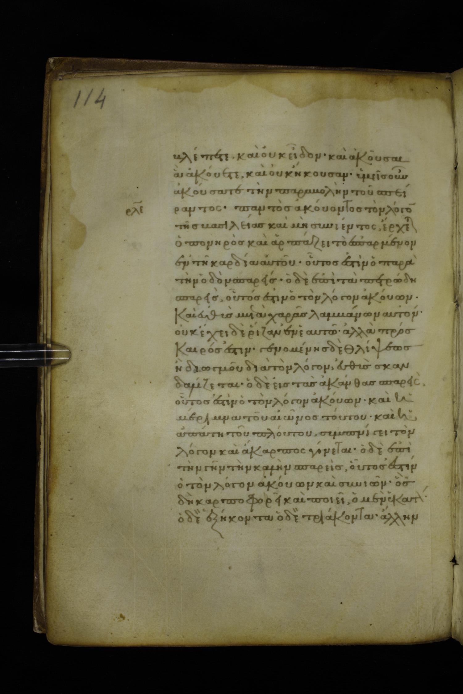Fourteenth century minuscule of the Gospels on parchment; 282 leaves, 1 column, 22-23 lines per column. Images were taken at the National Library of Greece in Athens.