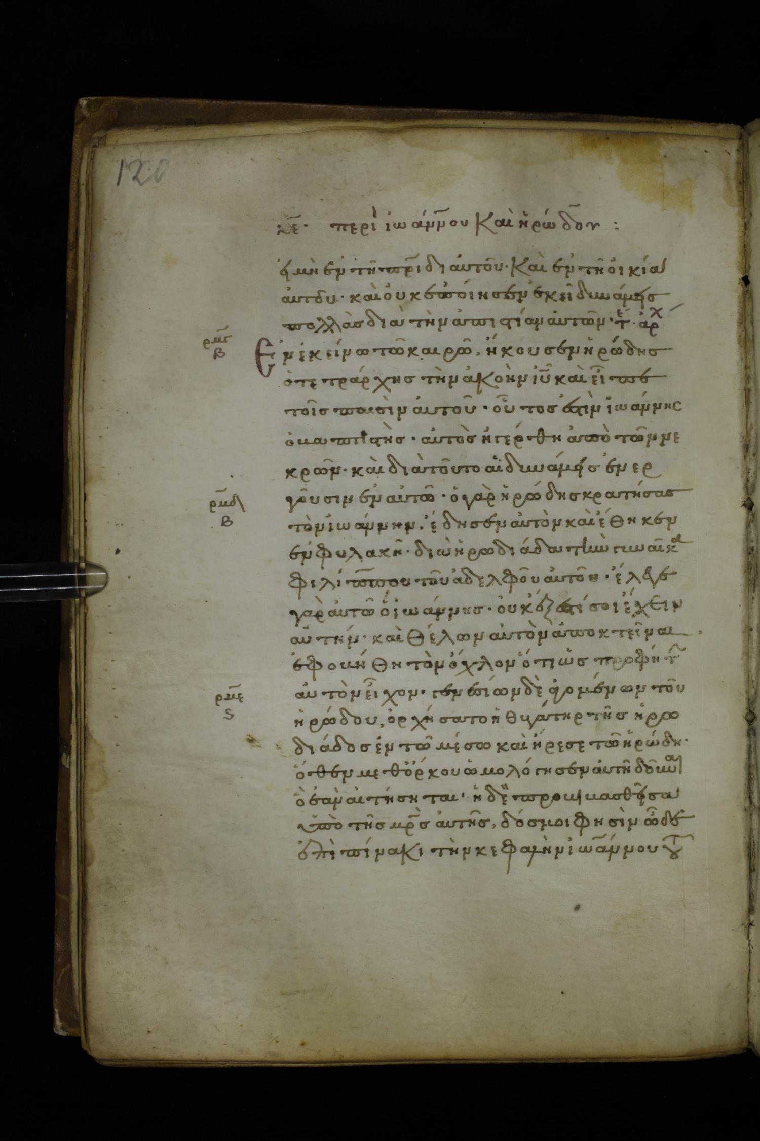 Fourteenth century minuscule of the Gospels on parchment; 282 leaves, 1 column, 22-23 lines per column. Images were taken at the National Library of Greece in Athens.