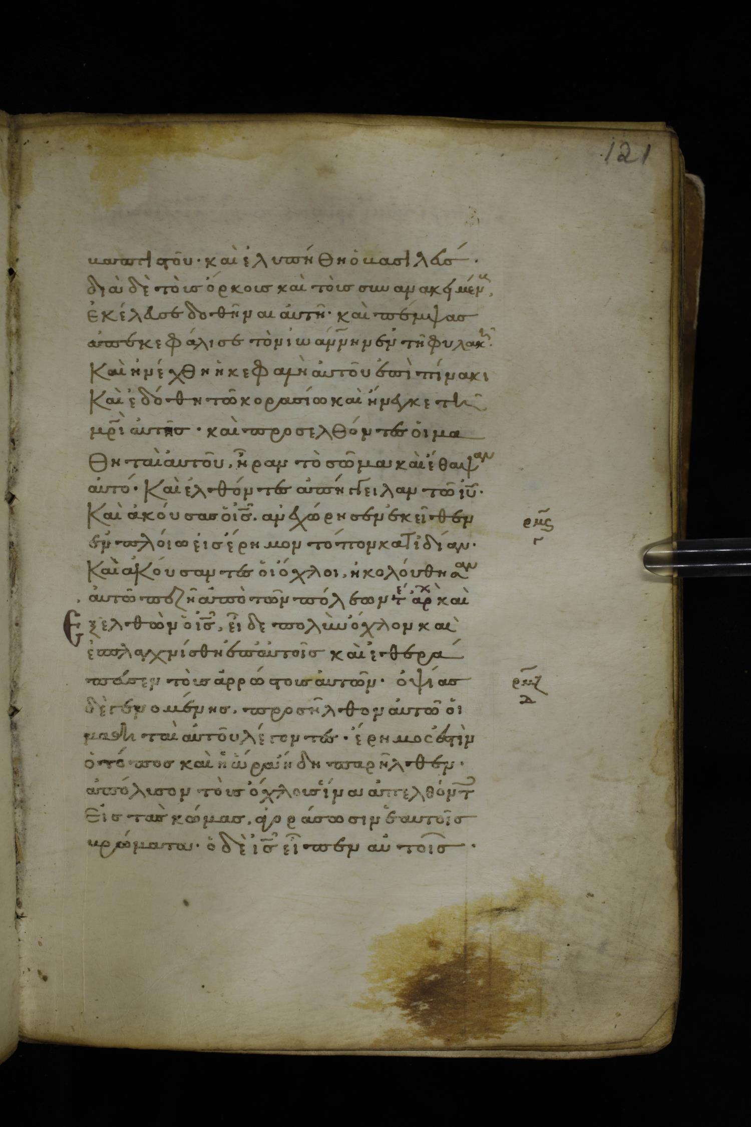 Fourteenth century minuscule of the Gospels on parchment; 282 leaves, 1 column, 22-23 lines per column. Images were taken at the National Library of Greece in Athens.