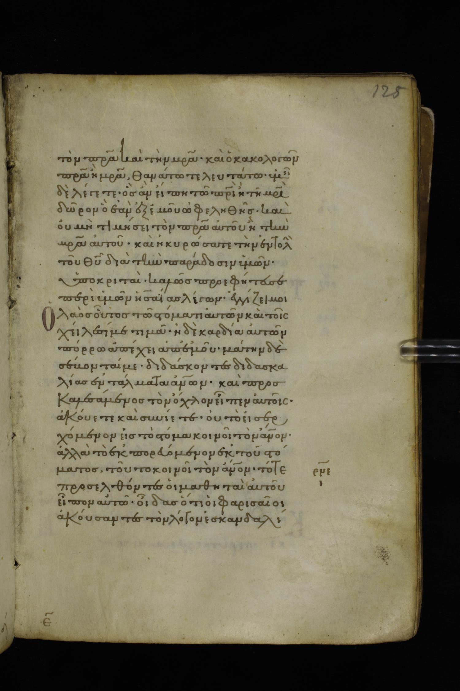 Fourteenth century minuscule of the Gospels on parchment; 282 leaves, 1 column, 22-23 lines per column. Images were taken at the National Library of Greece in Athens.