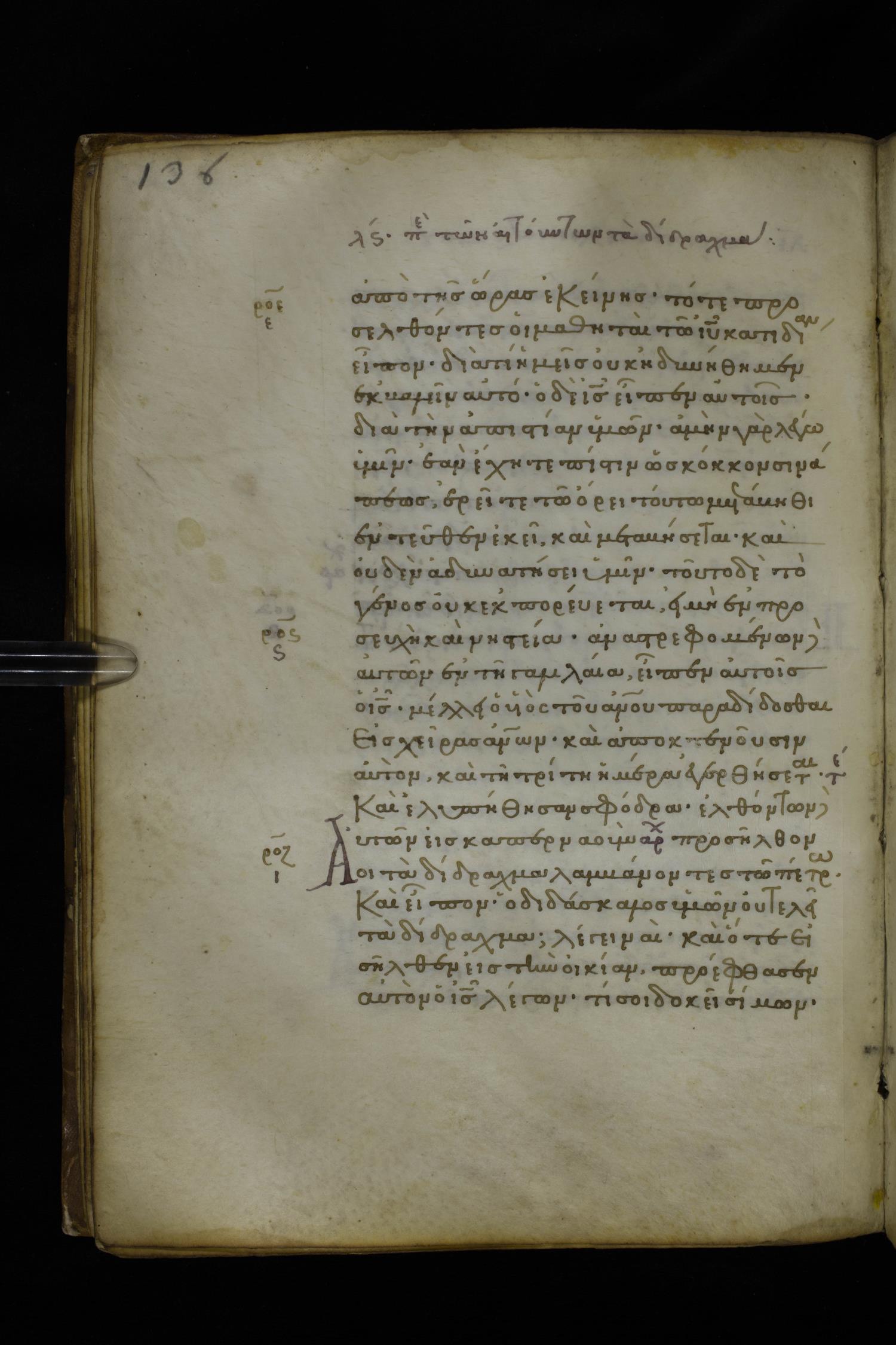 Fourteenth century minuscule of the Gospels on parchment; 282 leaves, 1 column, 22-23 lines per column. Images were taken at the National Library of Greece in Athens.