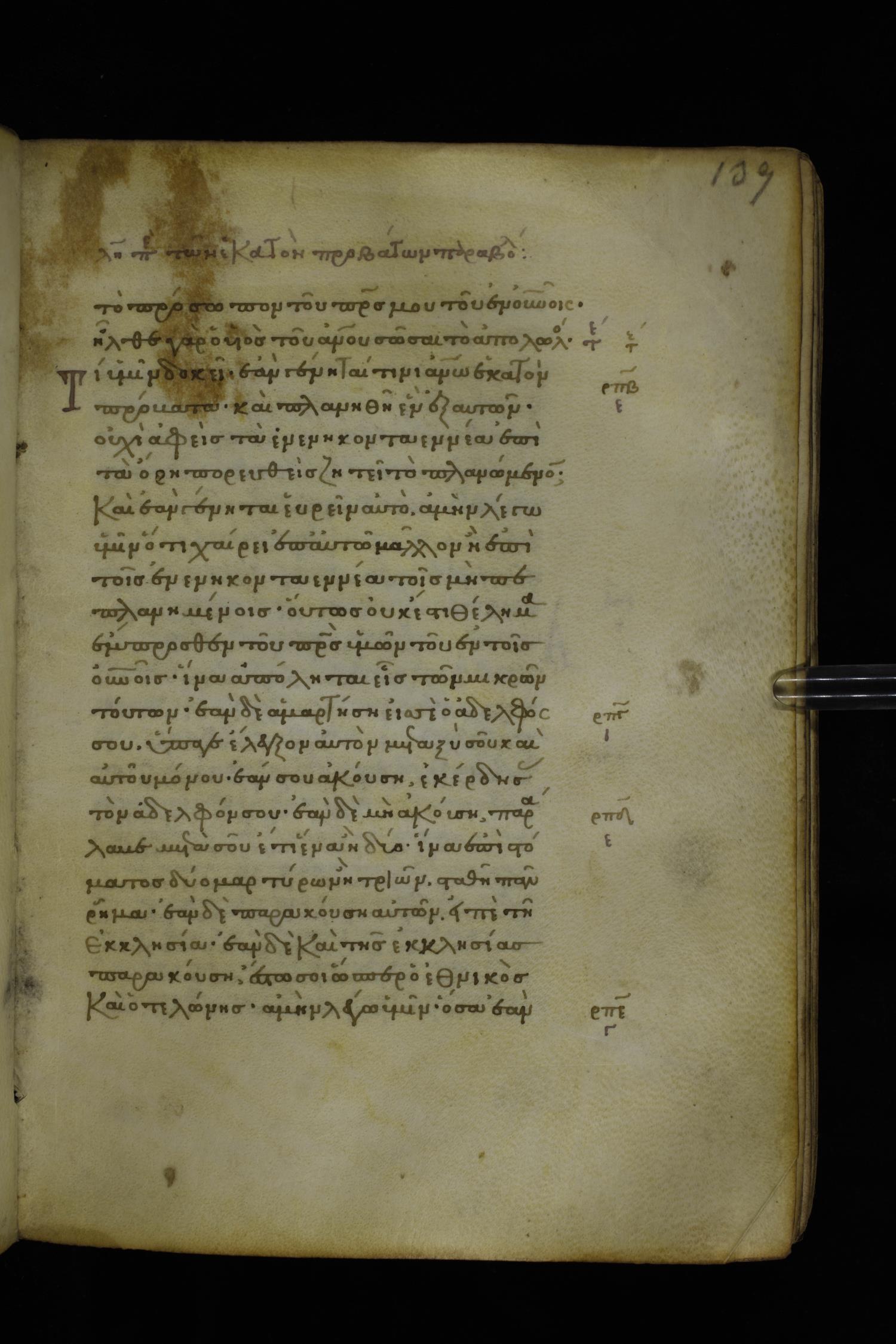 Fourteenth century minuscule of the Gospels on parchment; 282 leaves, 1 column, 22-23 lines per column. Images were taken at the National Library of Greece in Athens.