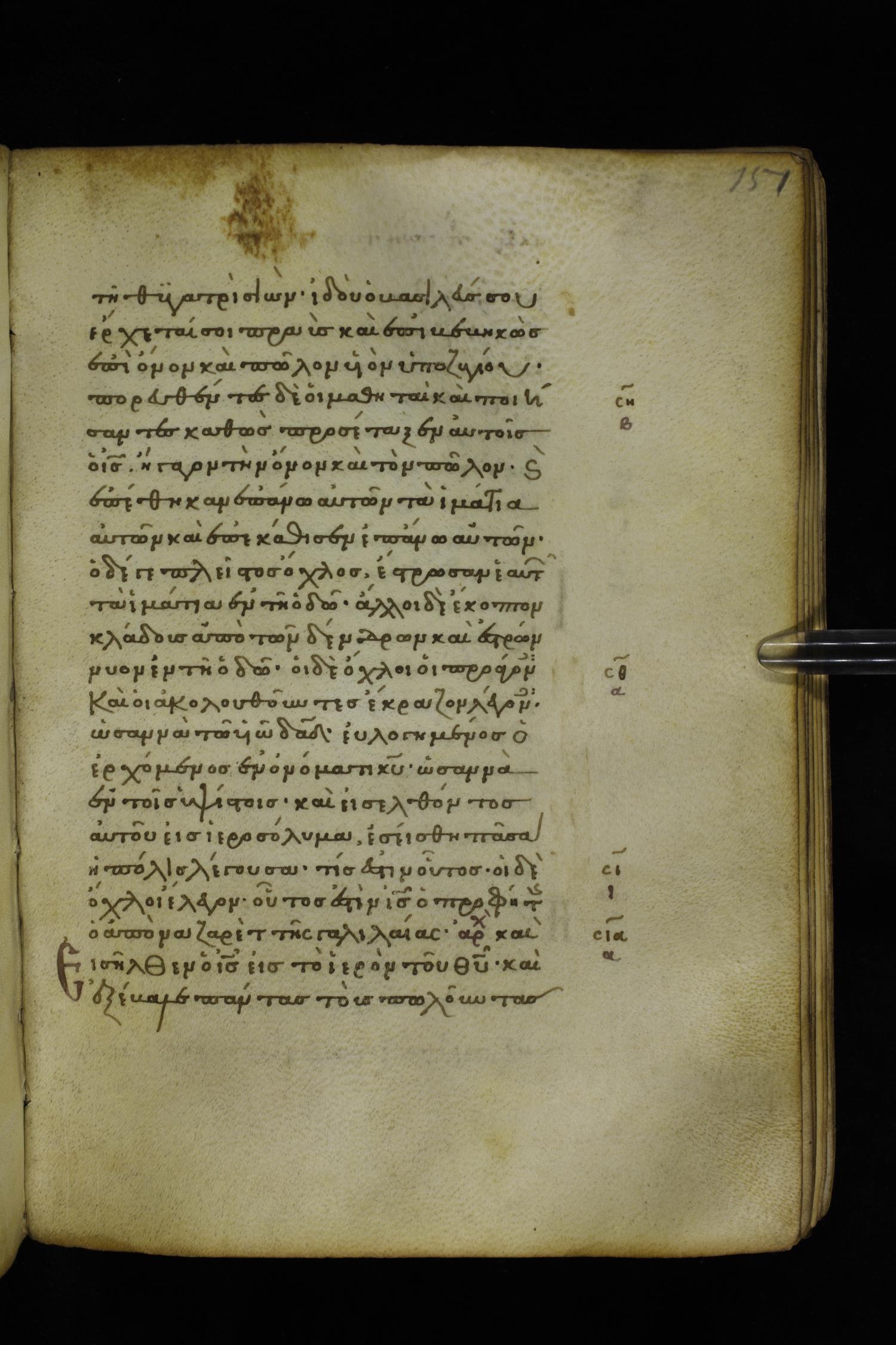 Fourteenth century minuscule of the Gospels on parchment; 282 leaves, 1 column, 22-23 lines per column. Images were taken at the National Library of Greece in Athens.