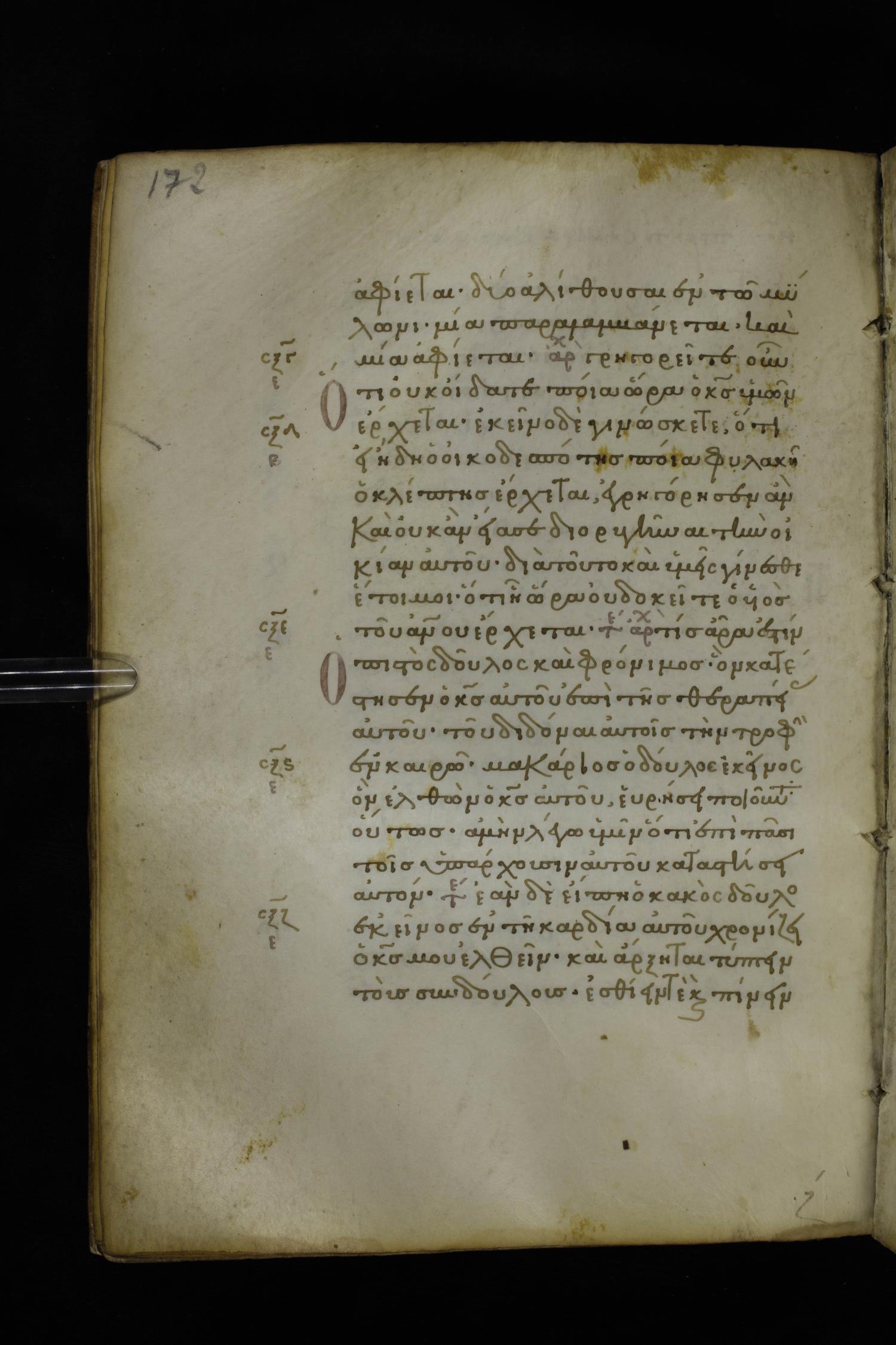 Fourteenth century minuscule of the Gospels on parchment; 282 leaves, 1 column, 22-23 lines per column. Images were taken at the National Library of Greece in Athens.