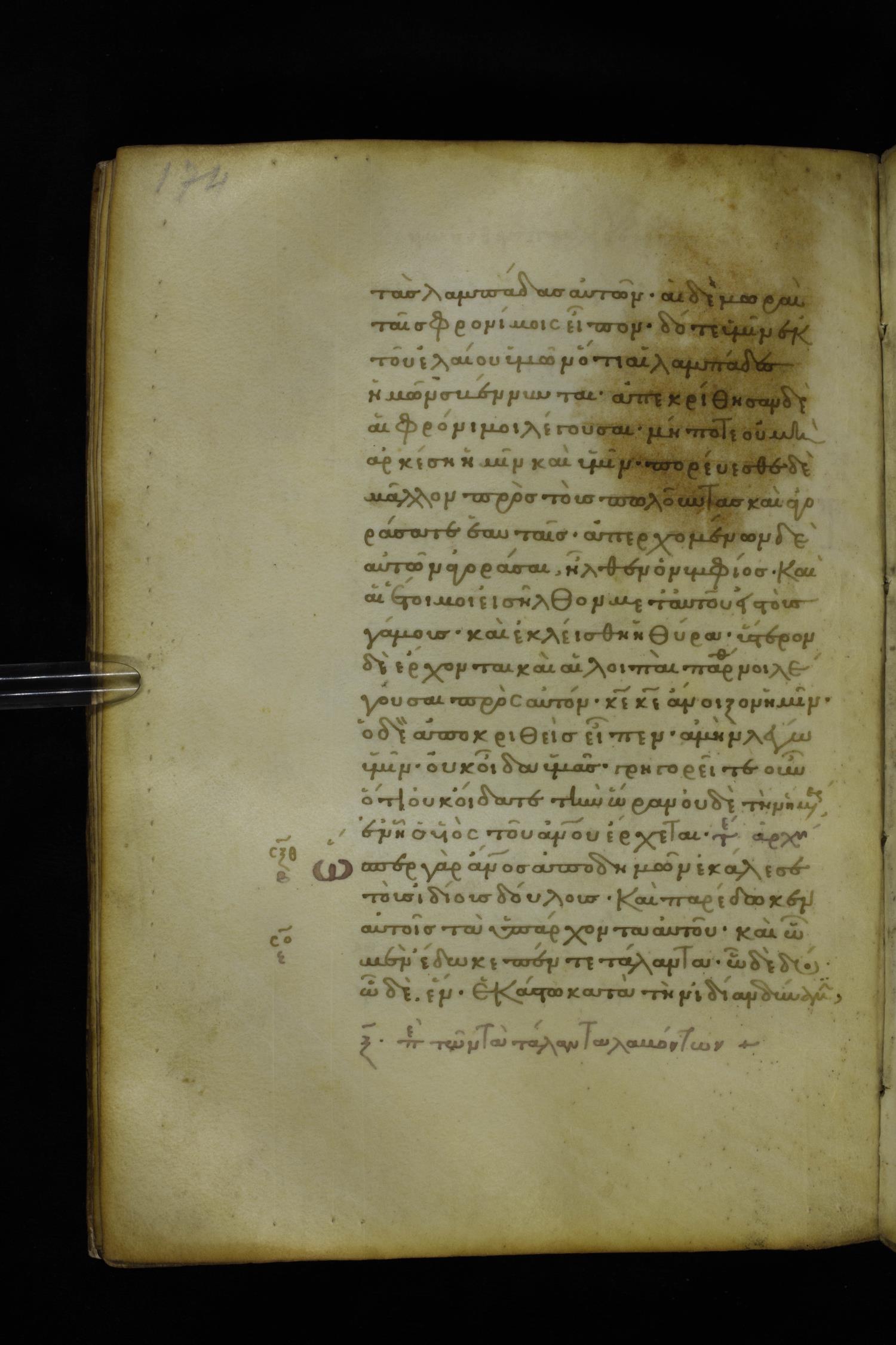 Fourteenth century minuscule of the Gospels on parchment; 282 leaves, 1 column, 22-23 lines per column. Images were taken at the National Library of Greece in Athens.