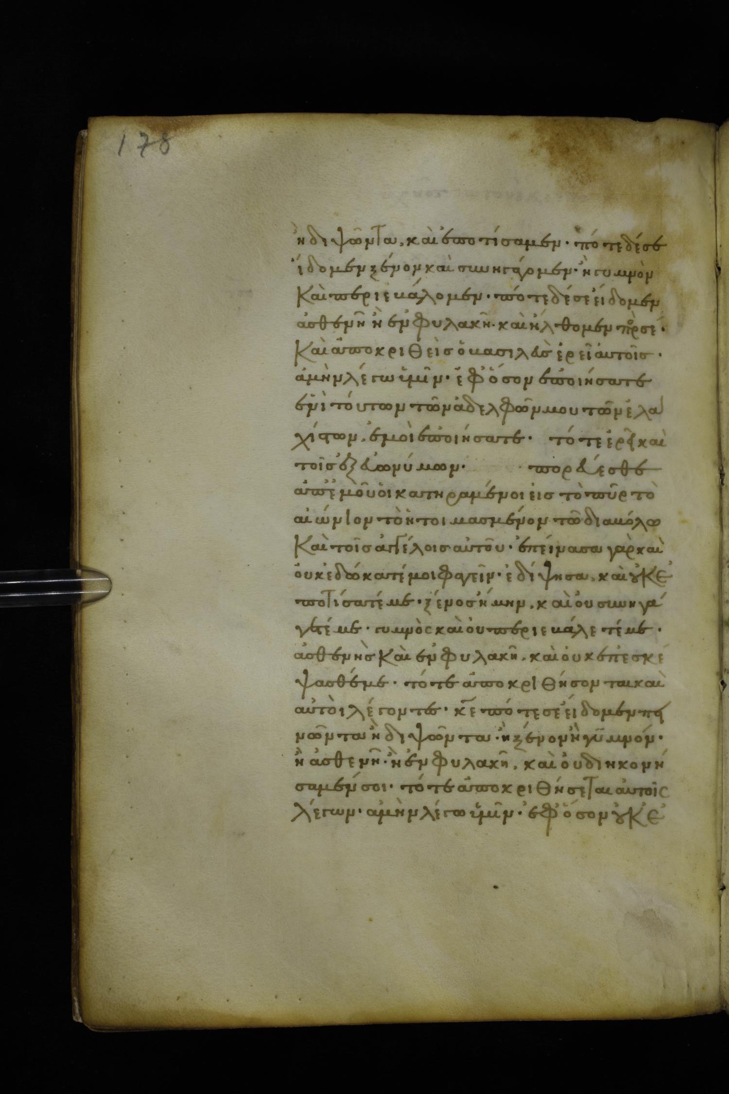 Fourteenth century minuscule of the Gospels on parchment; 282 leaves, 1 column, 22-23 lines per column. Images were taken at the National Library of Greece in Athens.