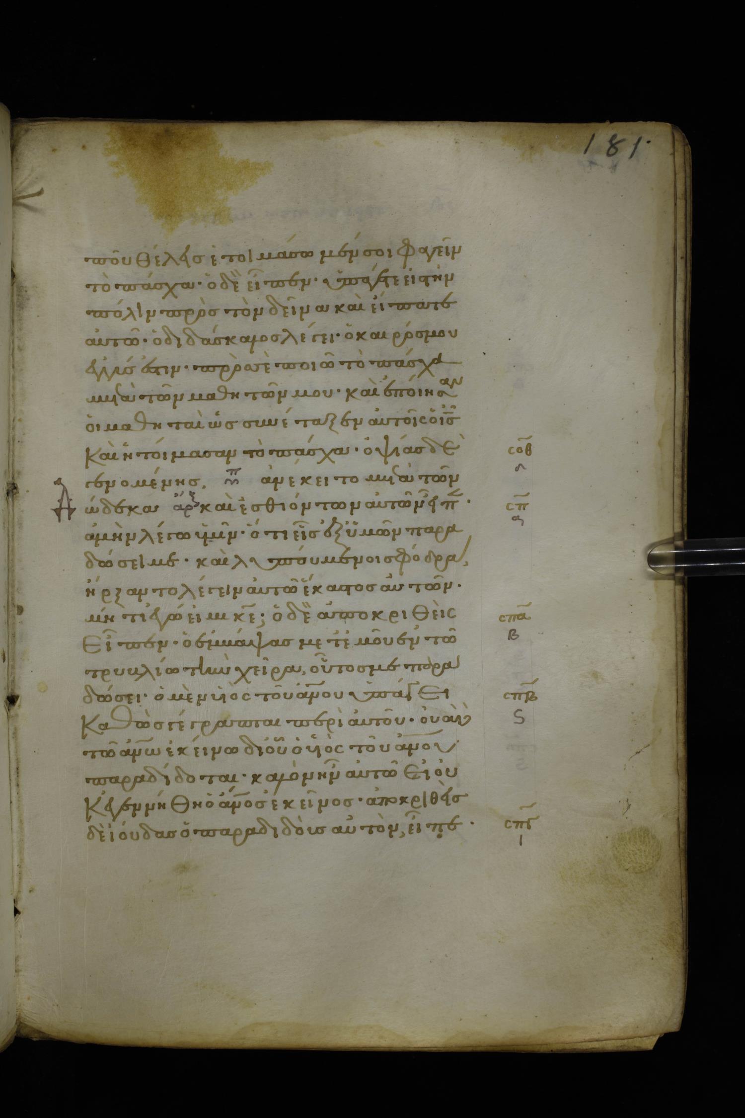 Fourteenth century minuscule of the Gospels on parchment; 282 leaves, 1 column, 22-23 lines per column. Images were taken at the National Library of Greece in Athens.