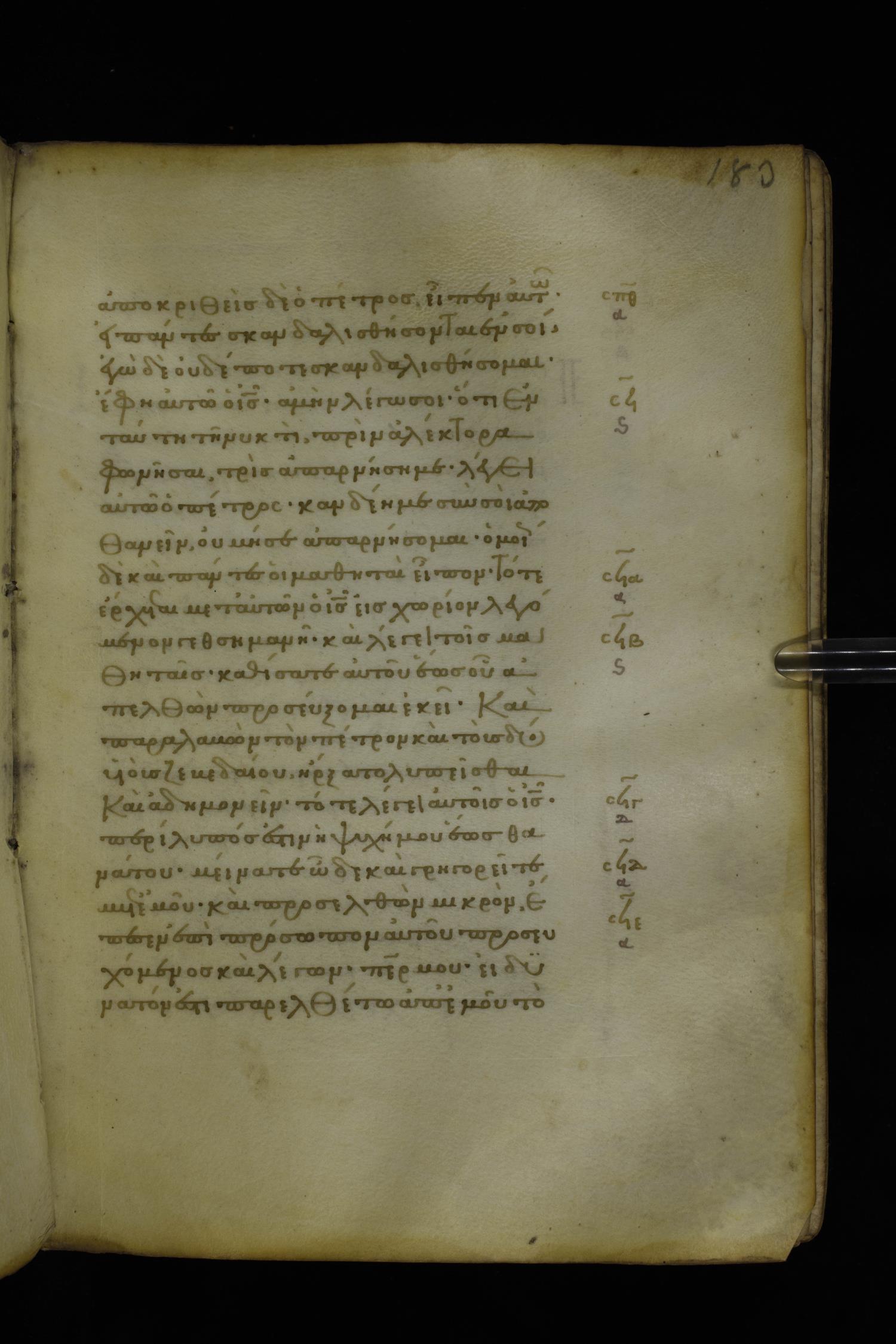 Fourteenth century minuscule of the Gospels on parchment; 282 leaves, 1 column, 22-23 lines per column. Images were taken at the National Library of Greece in Athens.