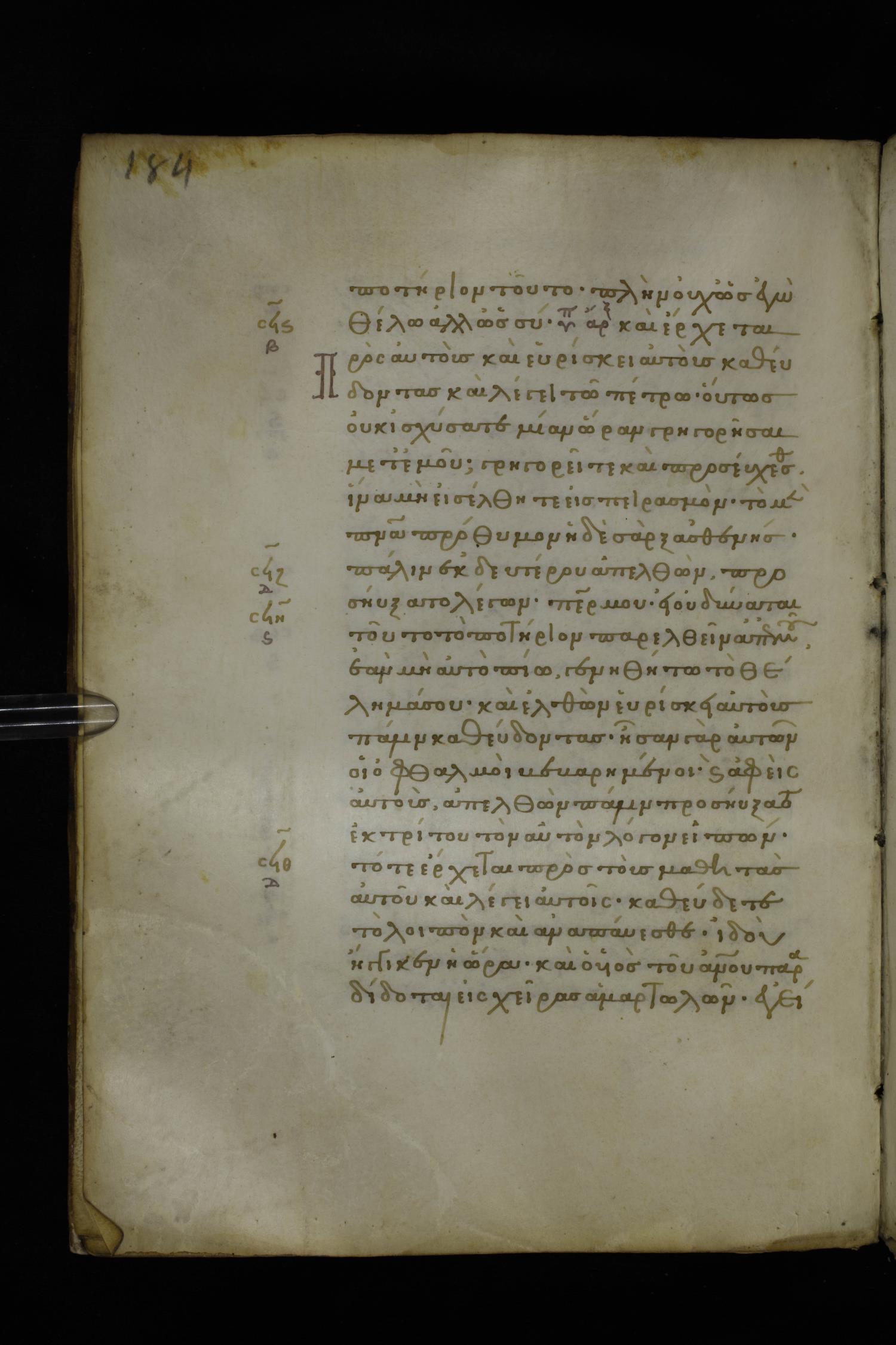 Fourteenth century minuscule of the Gospels on parchment; 282 leaves, 1 column, 22-23 lines per column. Images were taken at the National Library of Greece in Athens.