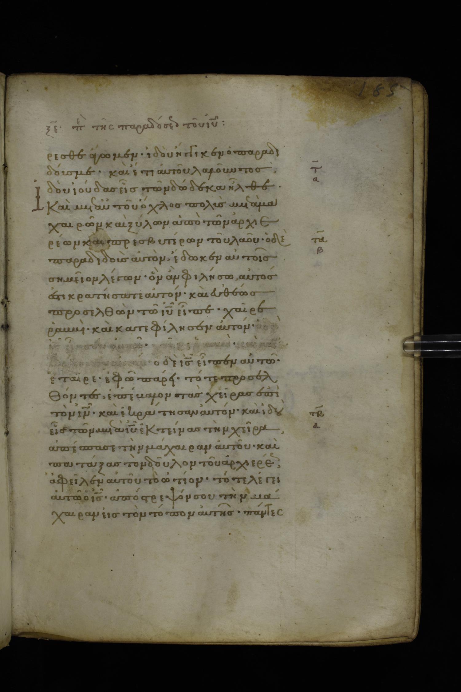 Fourteenth century minuscule of the Gospels on parchment; 282 leaves, 1 column, 22-23 lines per column. Images were taken at the National Library of Greece in Athens.