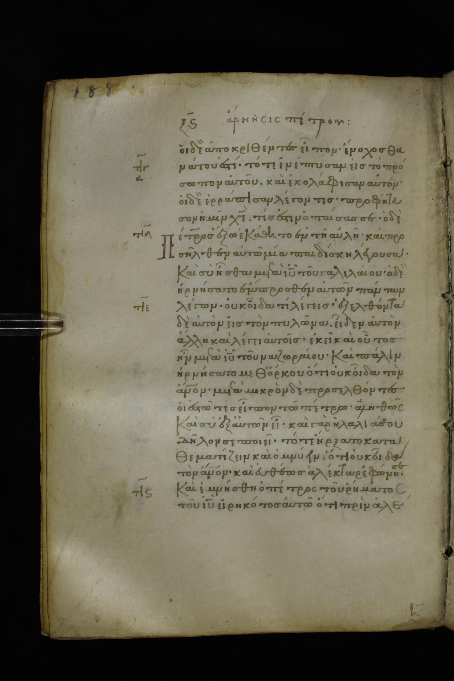 Fourteenth century minuscule of the Gospels on parchment; 282 leaves, 1 column, 22-23 lines per column. Images were taken at the National Library of Greece in Athens.