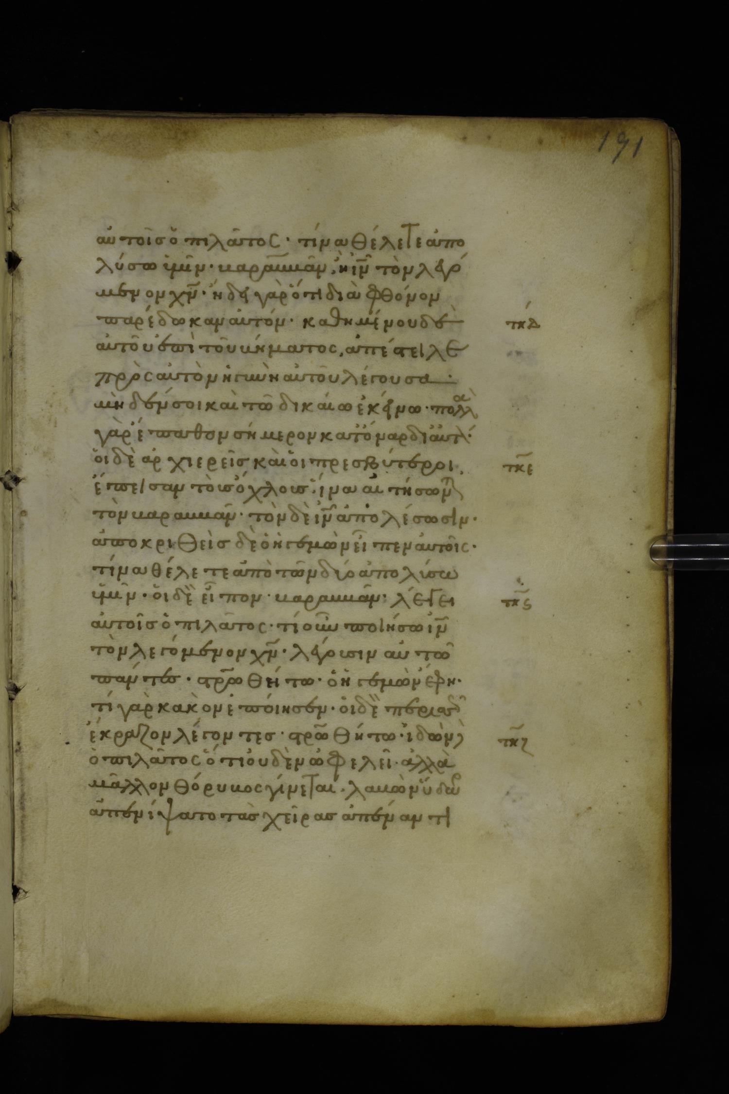 Fourteenth century minuscule of the Gospels on parchment; 282 leaves, 1 column, 22-23 lines per column. Images were taken at the National Library of Greece in Athens.