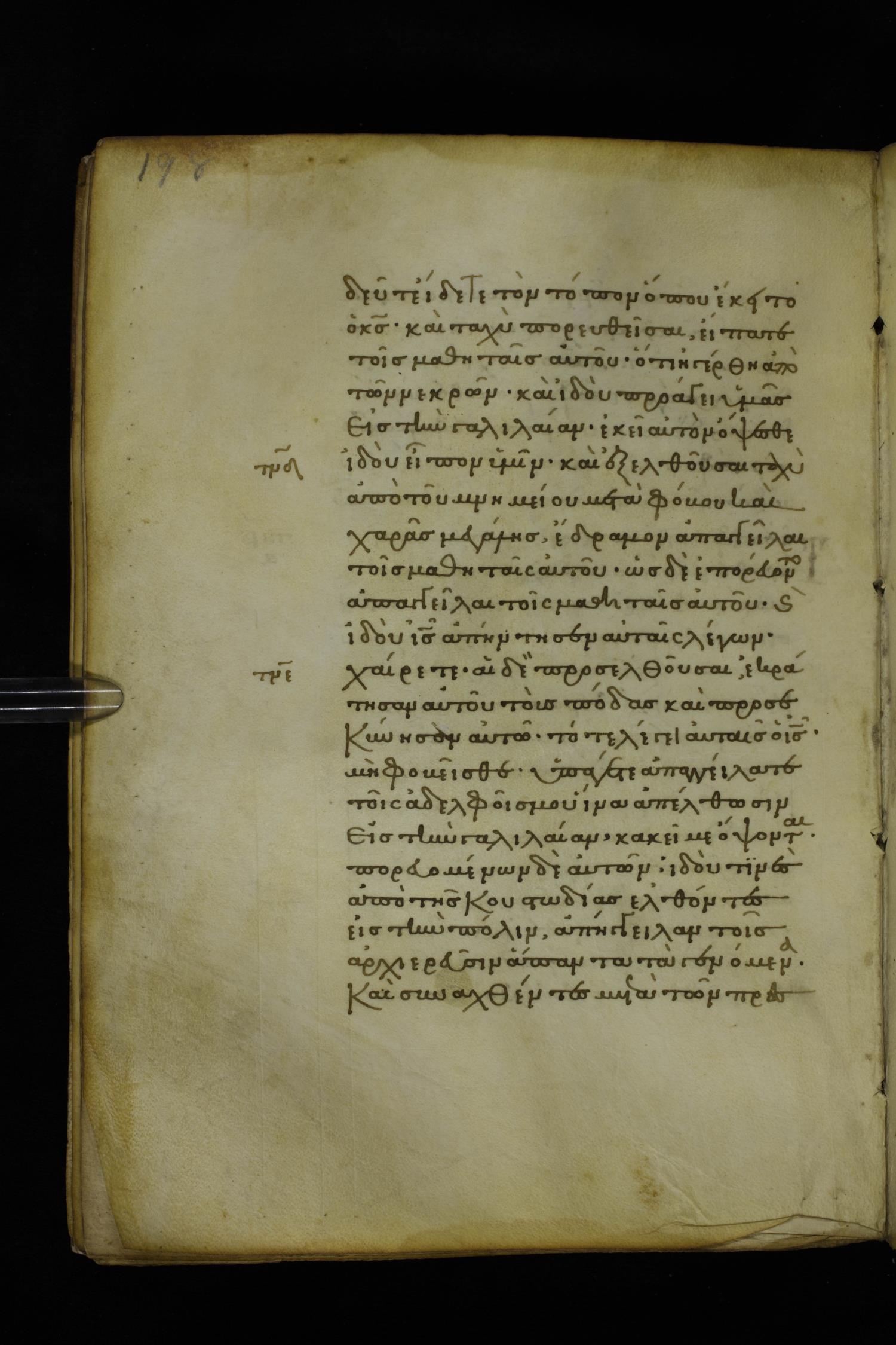 Fourteenth century minuscule of the Gospels on parchment; 282 leaves, 1 column, 22-23 lines per column. Images were taken at the National Library of Greece in Athens.