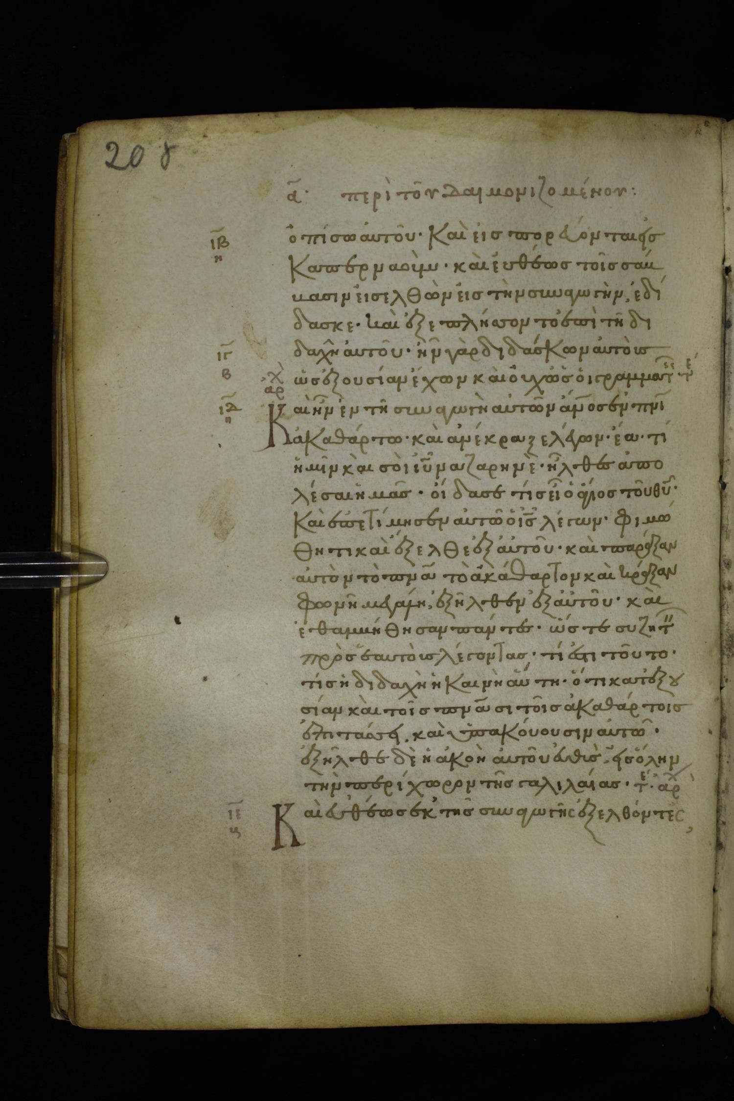 Fourteenth century minuscule of the Gospels on parchment; 282 leaves, 1 column, 22-23 lines per column. Images were taken at the National Library of Greece in Athens.