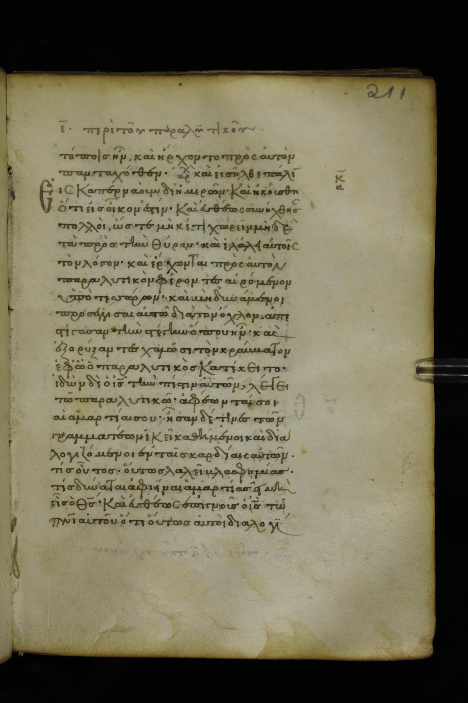Fourteenth century minuscule of the Gospels on parchment; 282 leaves, 1 column, 22-23 lines per column. Images were taken at the National Library of Greece in Athens.