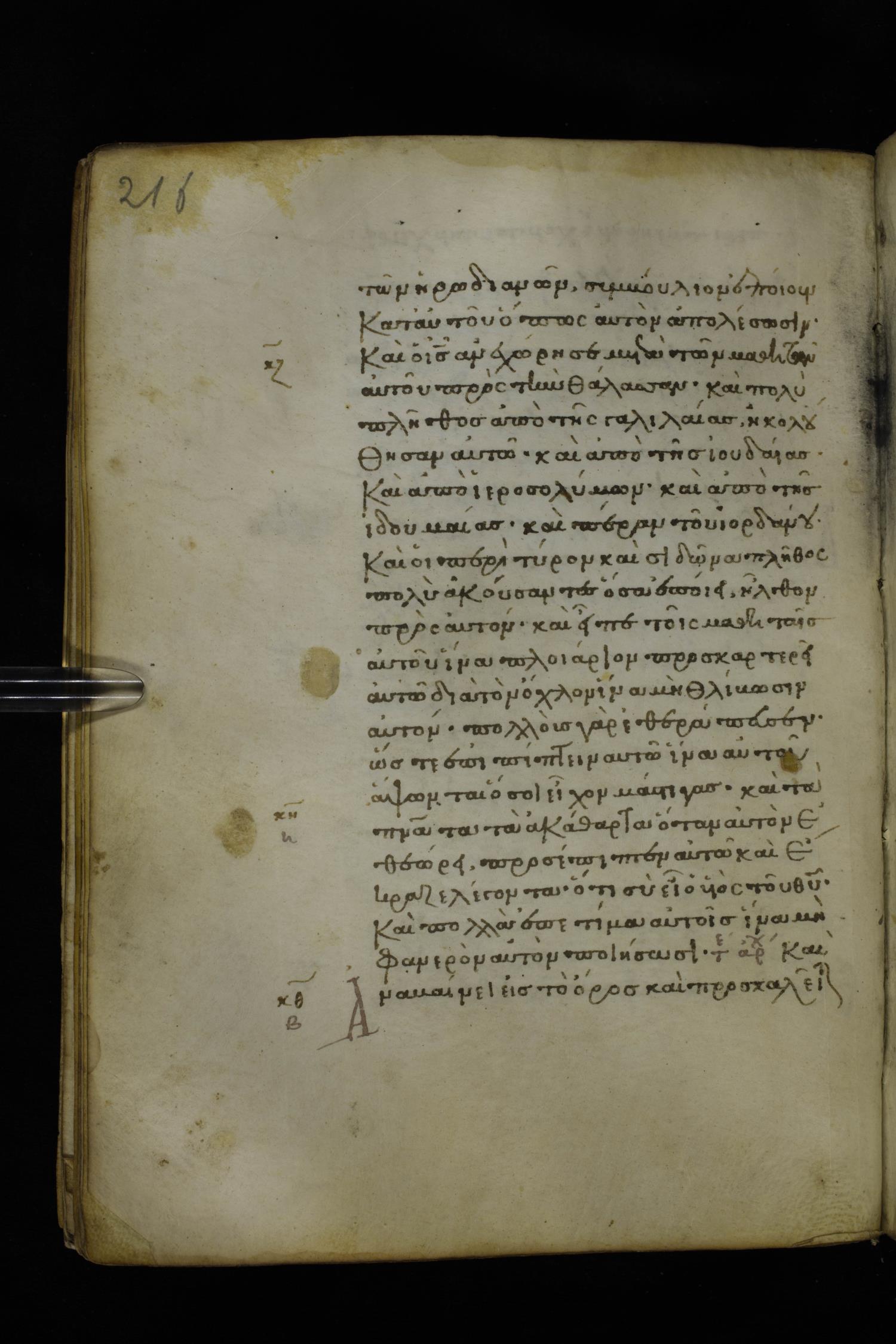 Fourteenth century minuscule of the Gospels on parchment; 282 leaves, 1 column, 22-23 lines per column. Images were taken at the National Library of Greece in Athens.