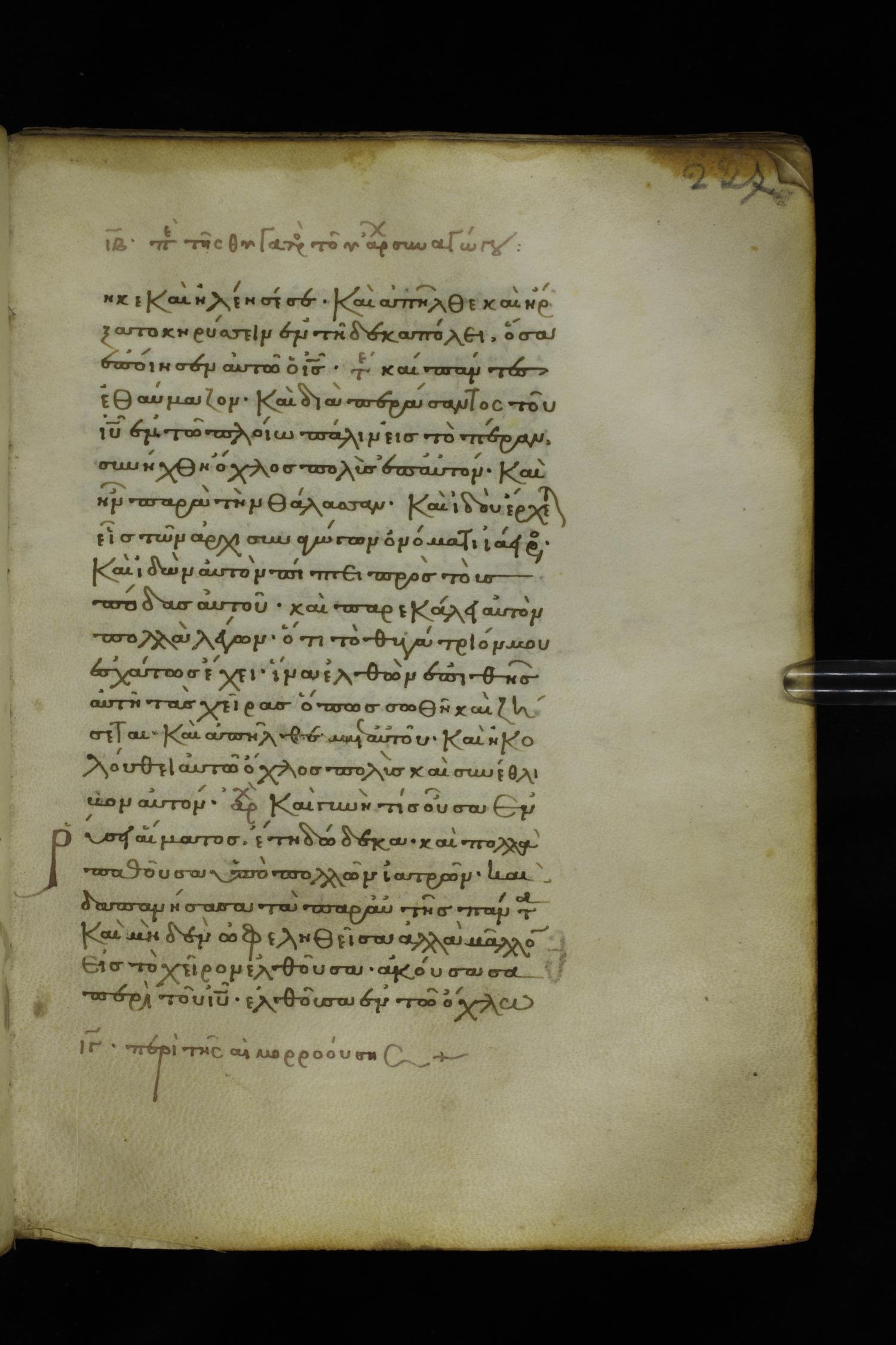 Fourteenth century minuscule of the Gospels on parchment; 282 leaves, 1 column, 22-23 lines per column. Images were taken at the National Library of Greece in Athens.