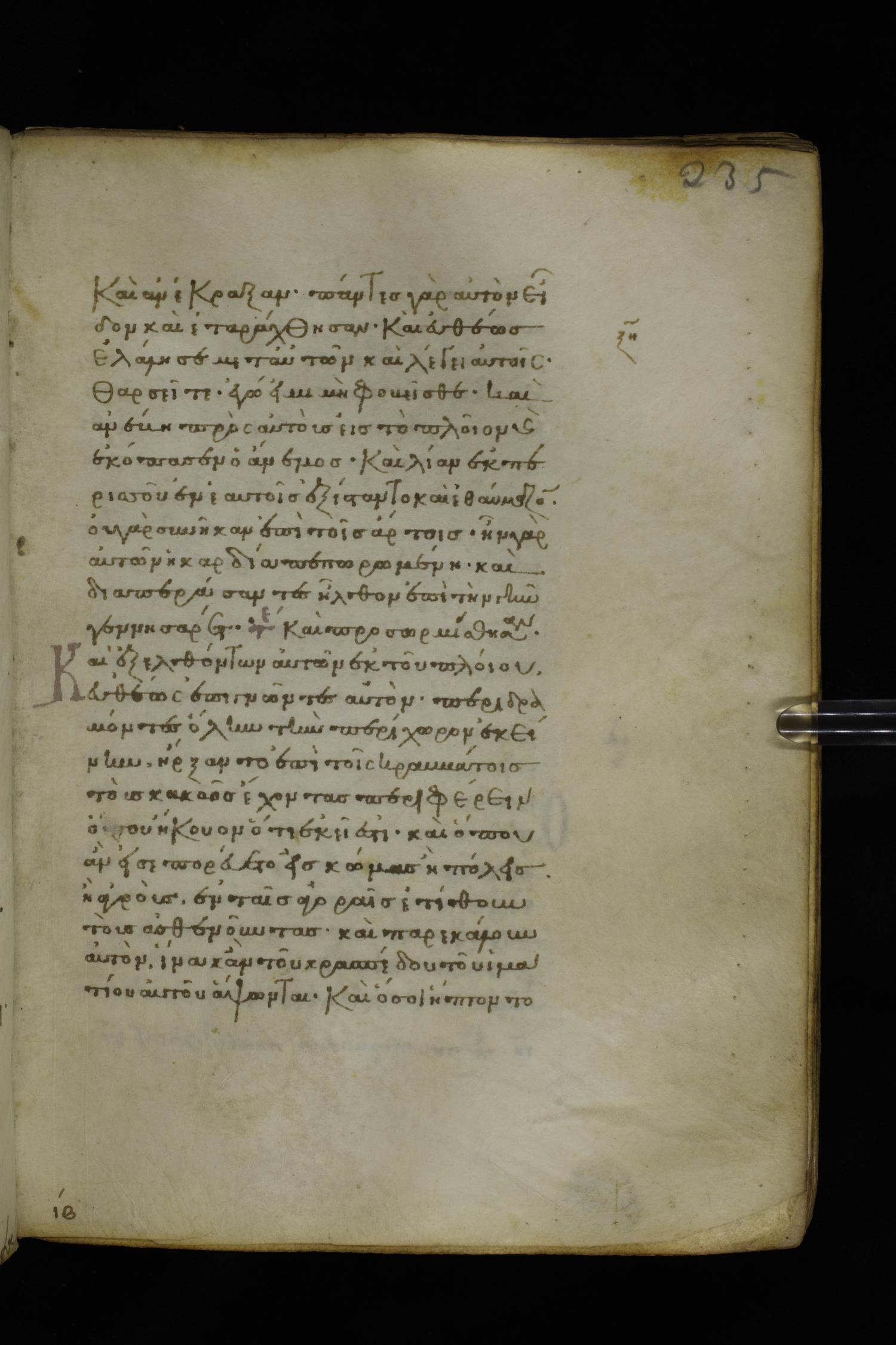 Fourteenth century minuscule of the Gospels on parchment; 282 leaves, 1 column, 22-23 lines per column. Images were taken at the National Library of Greece in Athens.