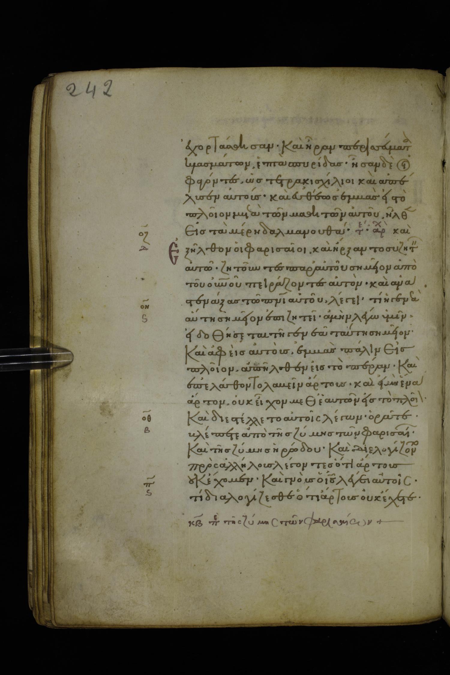 Fourteenth century minuscule of the Gospels on parchment; 282 leaves, 1 column, 22-23 lines per column. Images were taken at the National Library of Greece in Athens.