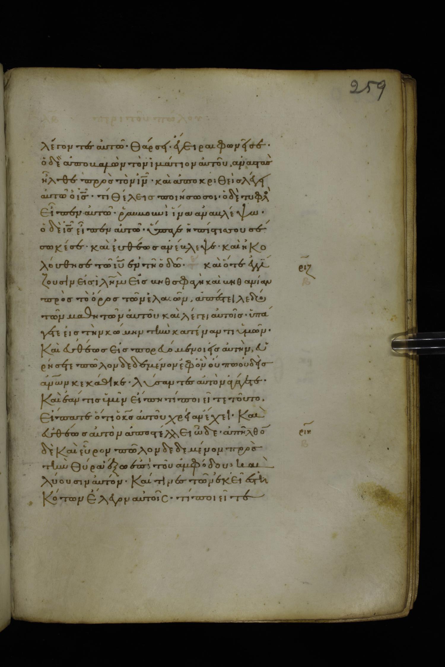 Fourteenth century minuscule of the Gospels on parchment; 282 leaves, 1 column, 22-23 lines per column. Images were taken at the National Library of Greece in Athens.