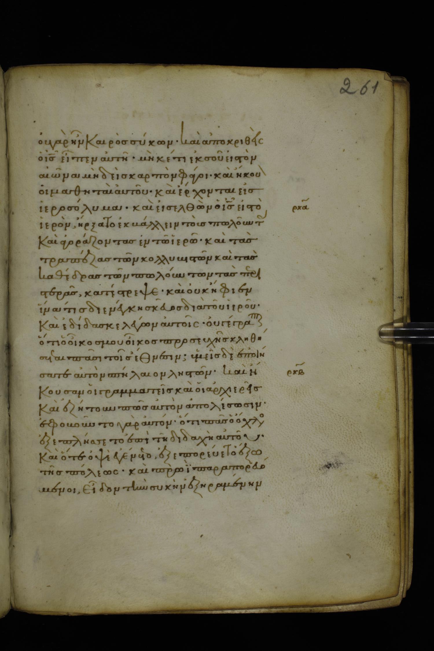 Fourteenth century minuscule of the Gospels on parchment; 282 leaves, 1 column, 22-23 lines per column. Images were taken at the National Library of Greece in Athens.