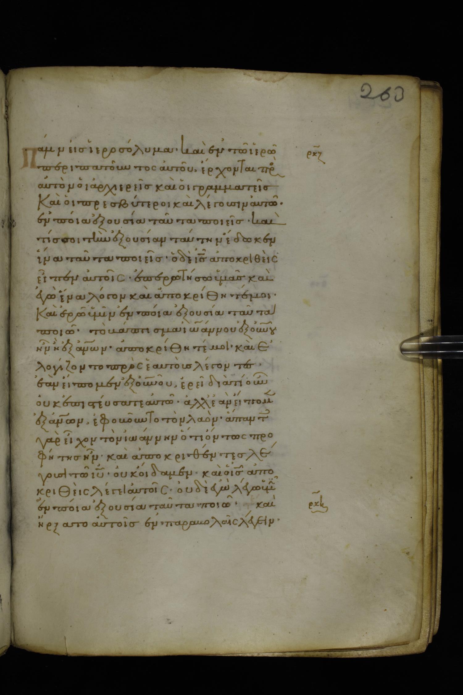 Fourteenth century minuscule of the Gospels on parchment; 282 leaves, 1 column, 22-23 lines per column. Images were taken at the National Library of Greece in Athens.