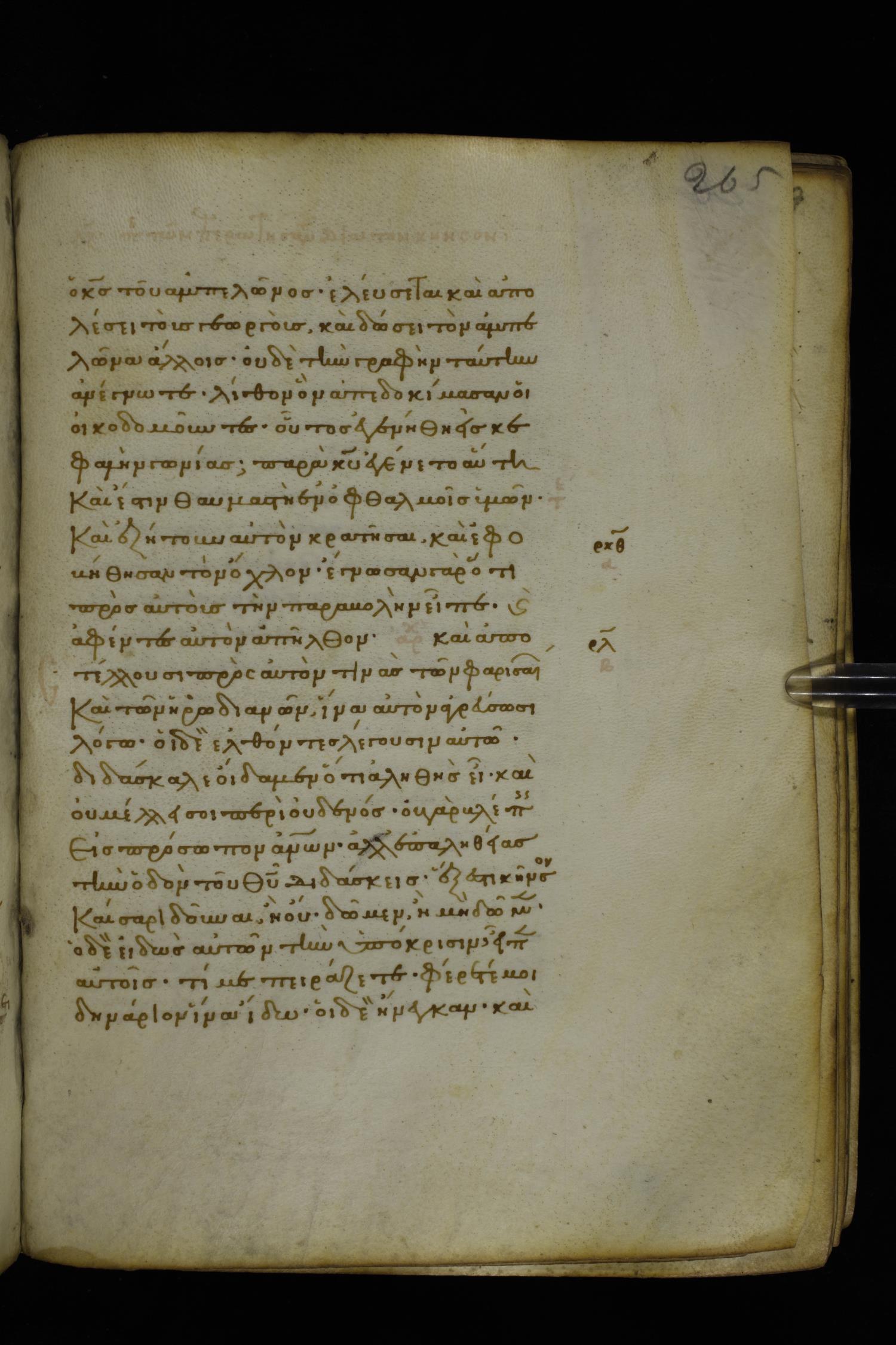 Fourteenth century minuscule of the Gospels on parchment; 282 leaves, 1 column, 22-23 lines per column. Images were taken at the National Library of Greece in Athens.