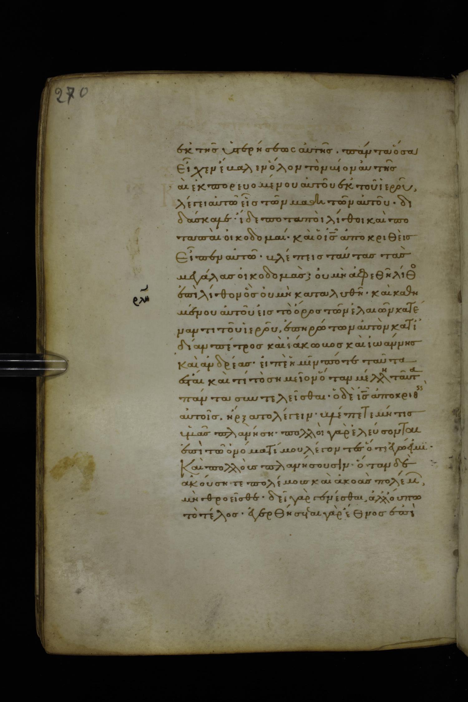Fourteenth century minuscule of the Gospels on parchment; 282 leaves, 1 column, 22-23 lines per column. Images were taken at the National Library of Greece in Athens.