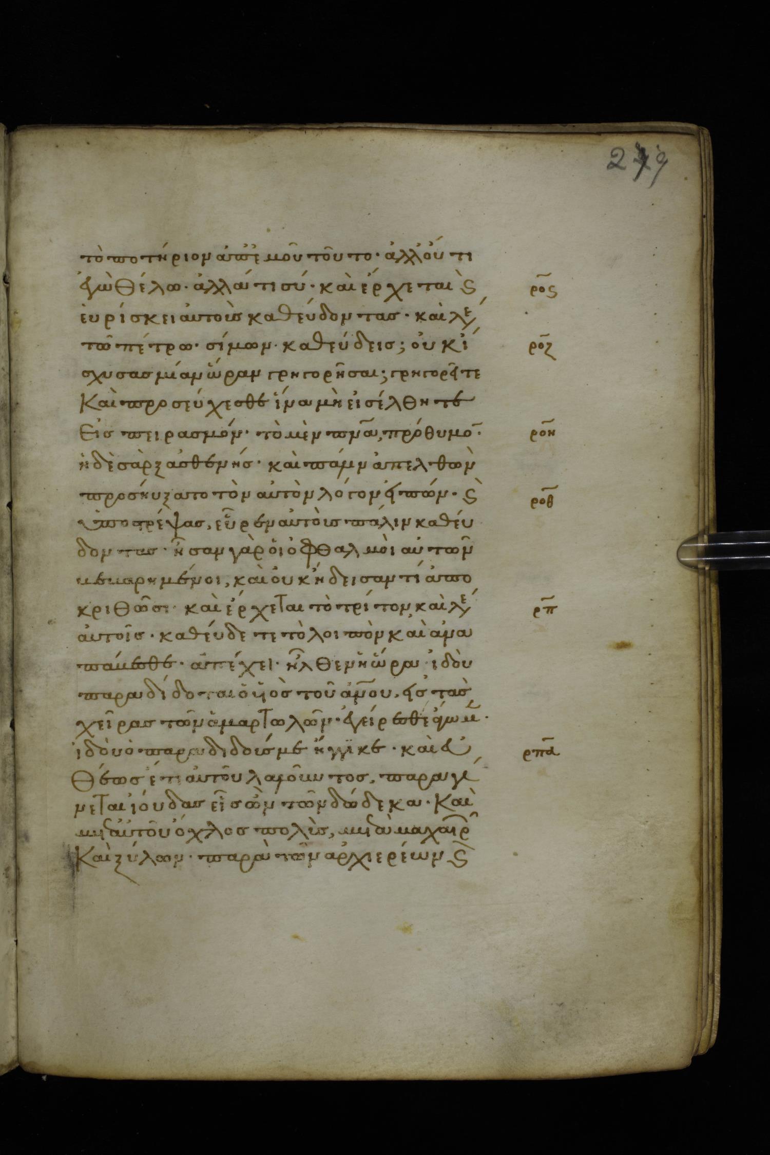 Fourteenth century minuscule of the Gospels on parchment; 282 leaves, 1 column, 22-23 lines per column. Images were taken at the National Library of Greece in Athens.