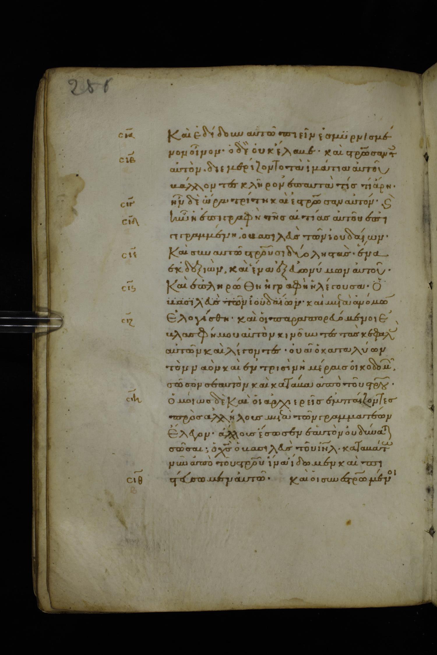 Fourteenth century minuscule of the Gospels on parchment; 282 leaves, 1 column, 22-23 lines per column. Images were taken at the National Library of Greece in Athens.