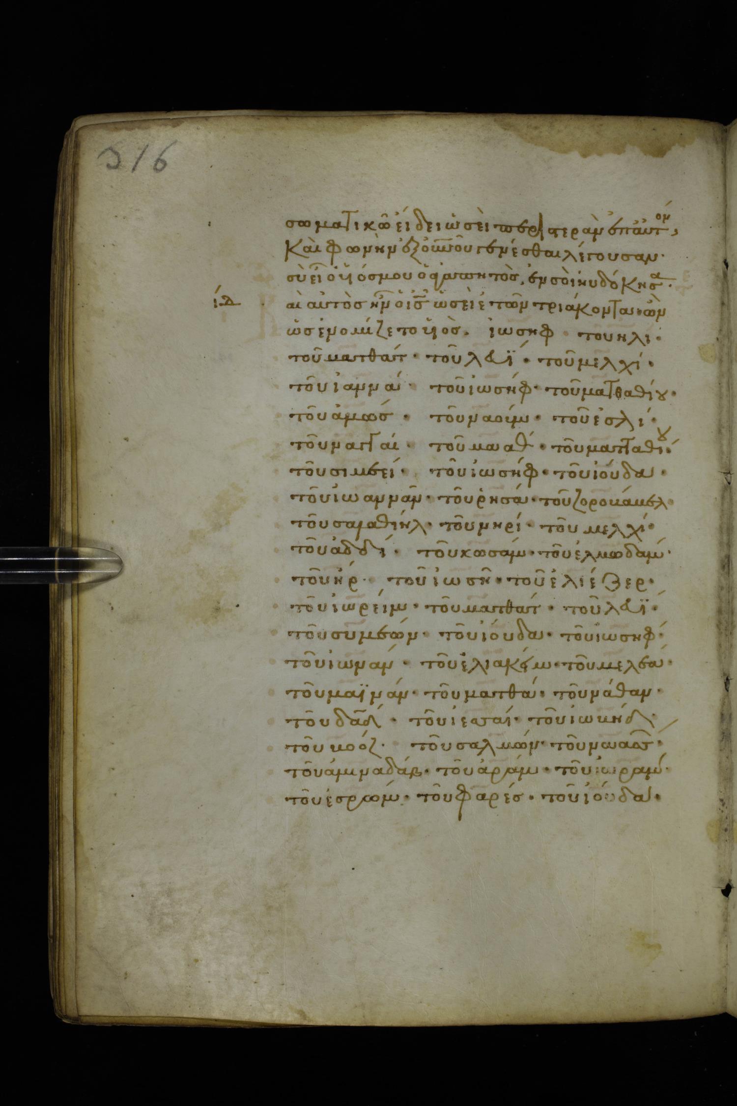 Fourteenth century minuscule of the Gospels on parchment; 282 leaves, 1 column, 22-23 lines per column. Images were taken at the National Library of Greece in Athens.