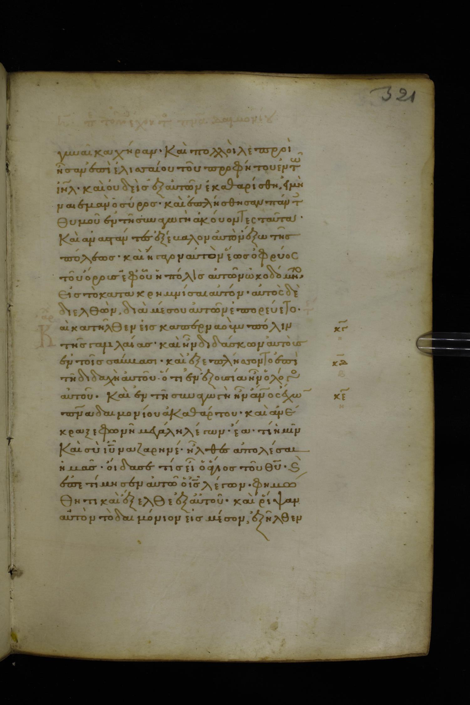 Fourteenth century minuscule of the Gospels on parchment; 282 leaves, 1 column, 22-23 lines per column. Images were taken at the National Library of Greece in Athens.