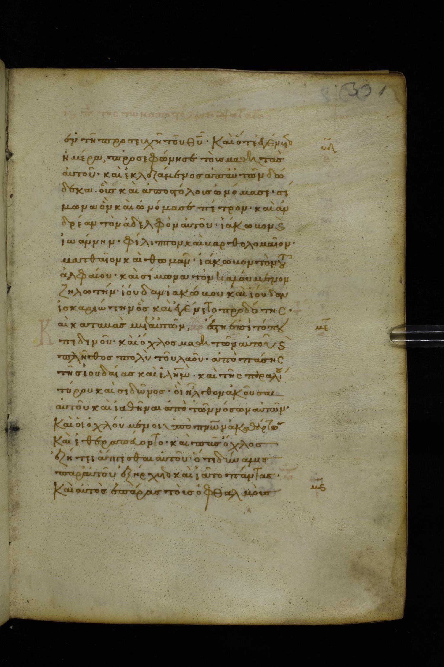 Fourteenth century minuscule of the Gospels on parchment; 282 leaves, 1 column, 22-23 lines per column. Images were taken at the National Library of Greece in Athens.