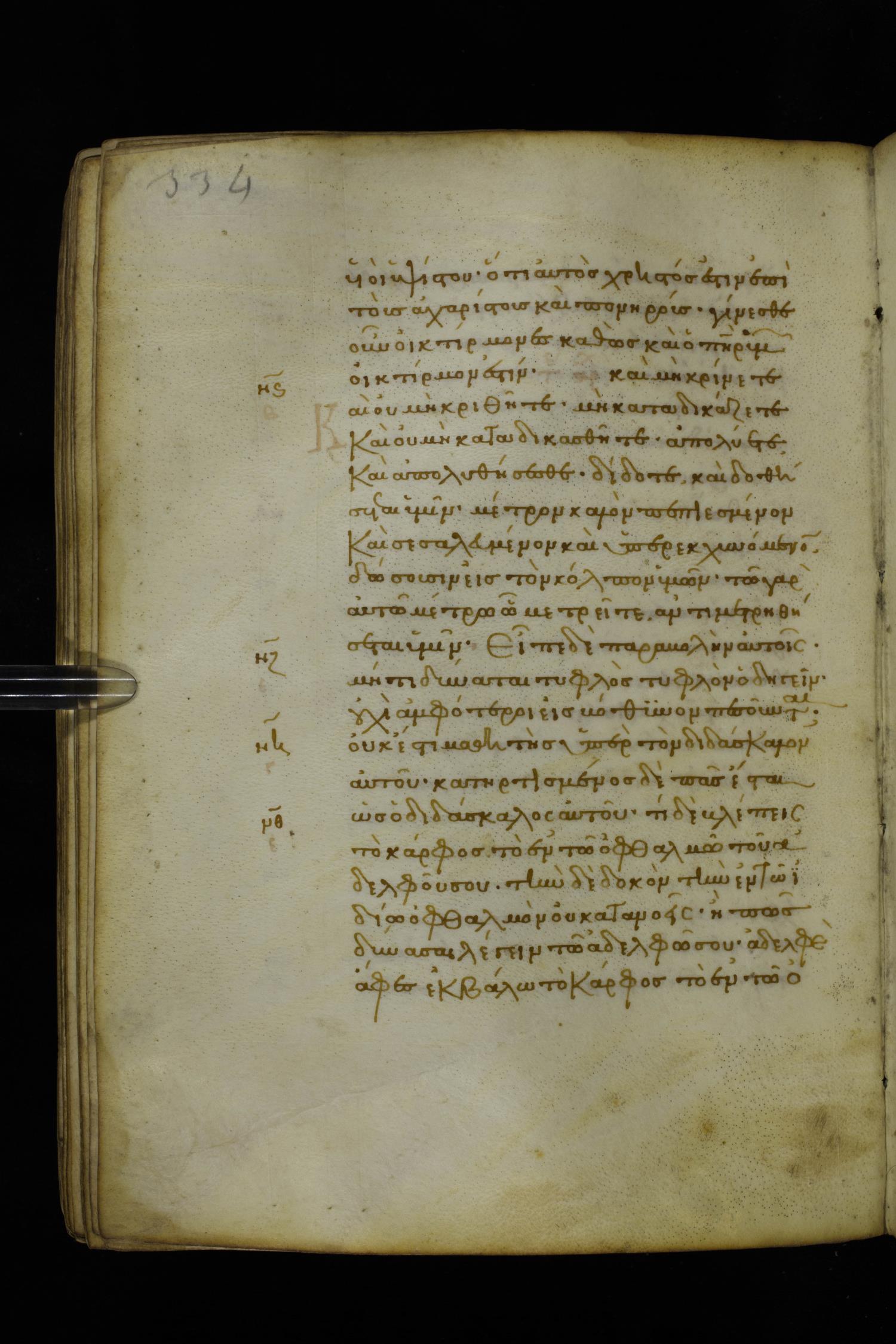 Fourteenth century minuscule of the Gospels on parchment; 282 leaves, 1 column, 22-23 lines per column. Images were taken at the National Library of Greece in Athens.