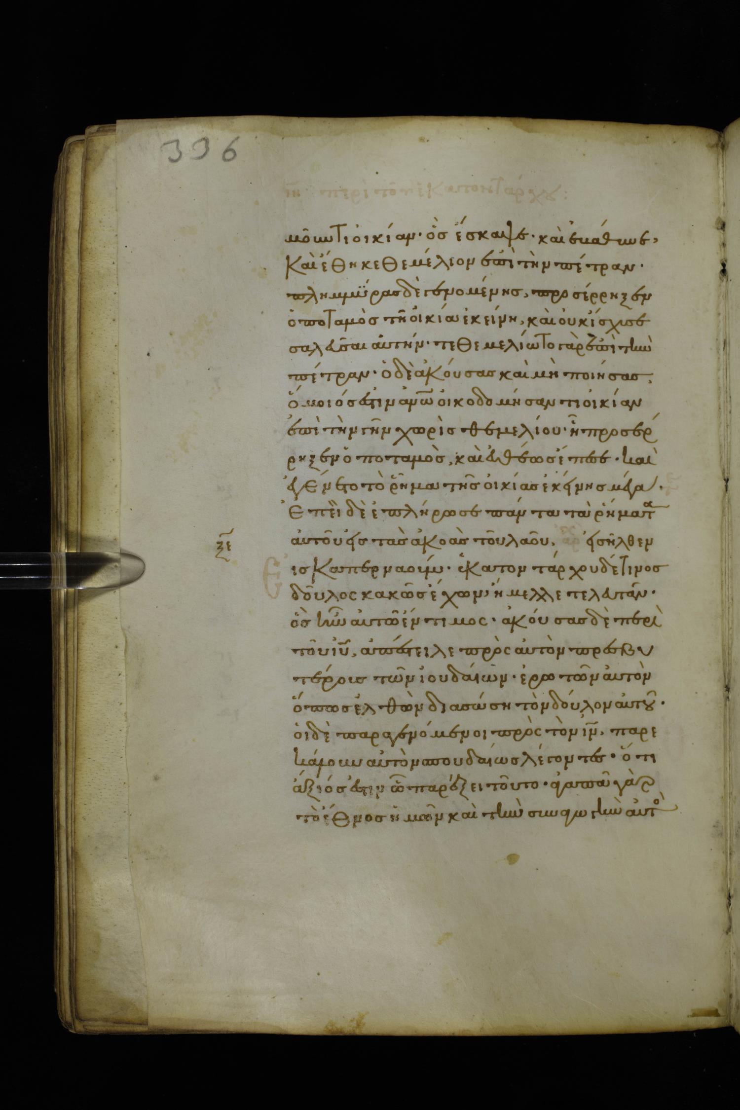 Fourteenth century minuscule of the Gospels on parchment; 282 leaves, 1 column, 22-23 lines per column. Images were taken at the National Library of Greece in Athens.