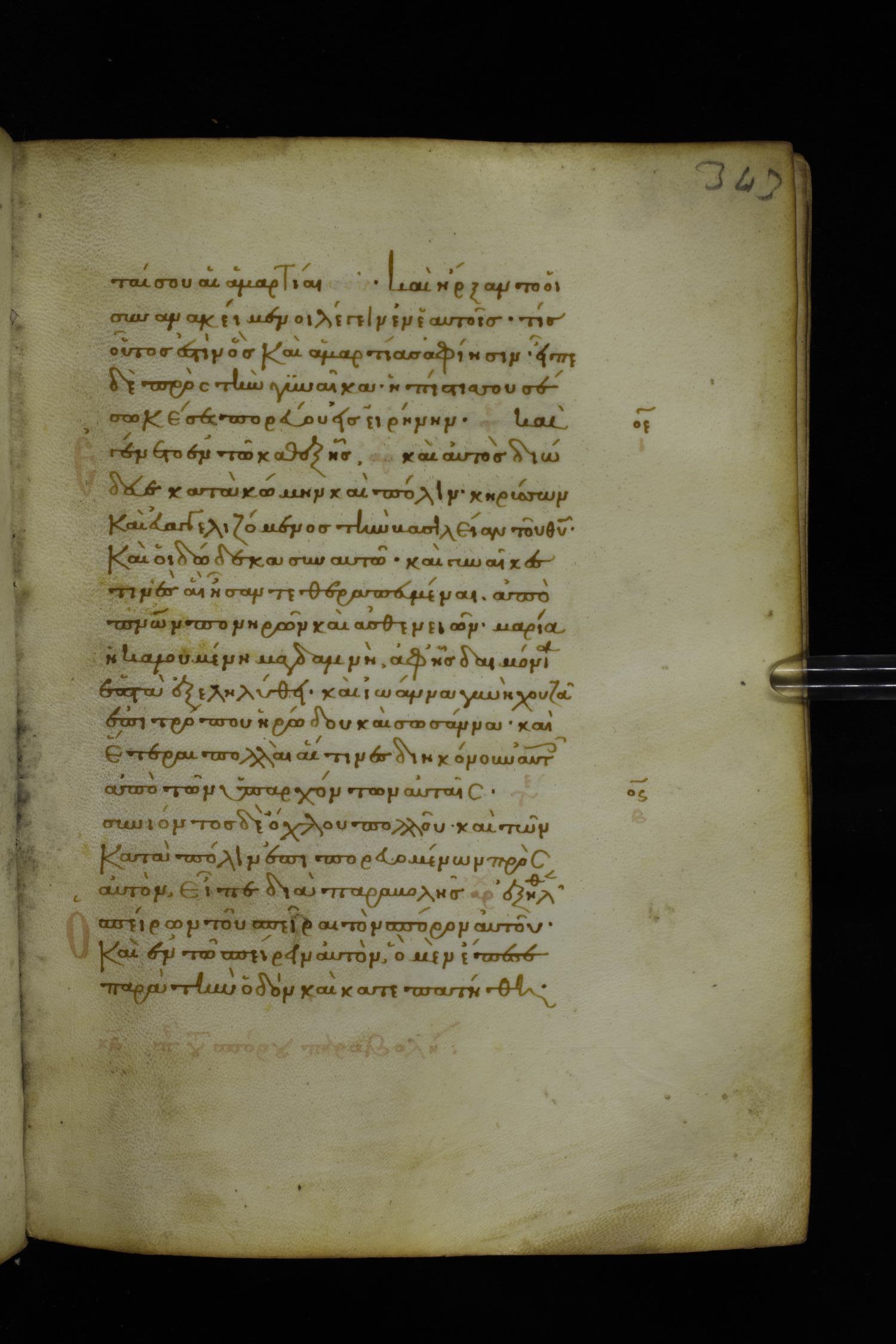 Fourteenth century minuscule of the Gospels on parchment; 282 leaves, 1 column, 22-23 lines per column. Images were taken at the National Library of Greece in Athens.