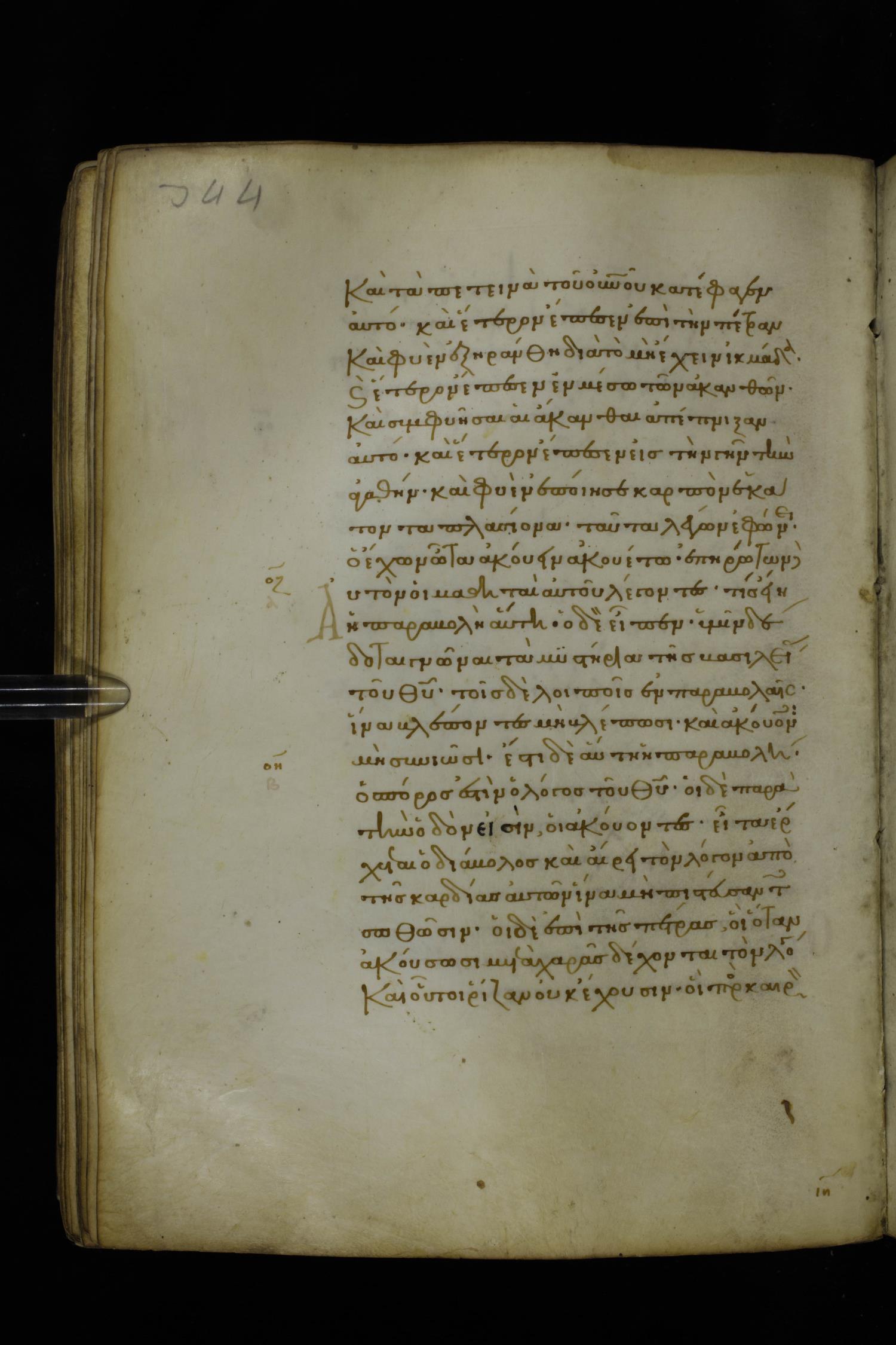 Fourteenth century minuscule of the Gospels on parchment; 282 leaves, 1 column, 22-23 lines per column. Images were taken at the National Library of Greece in Athens.