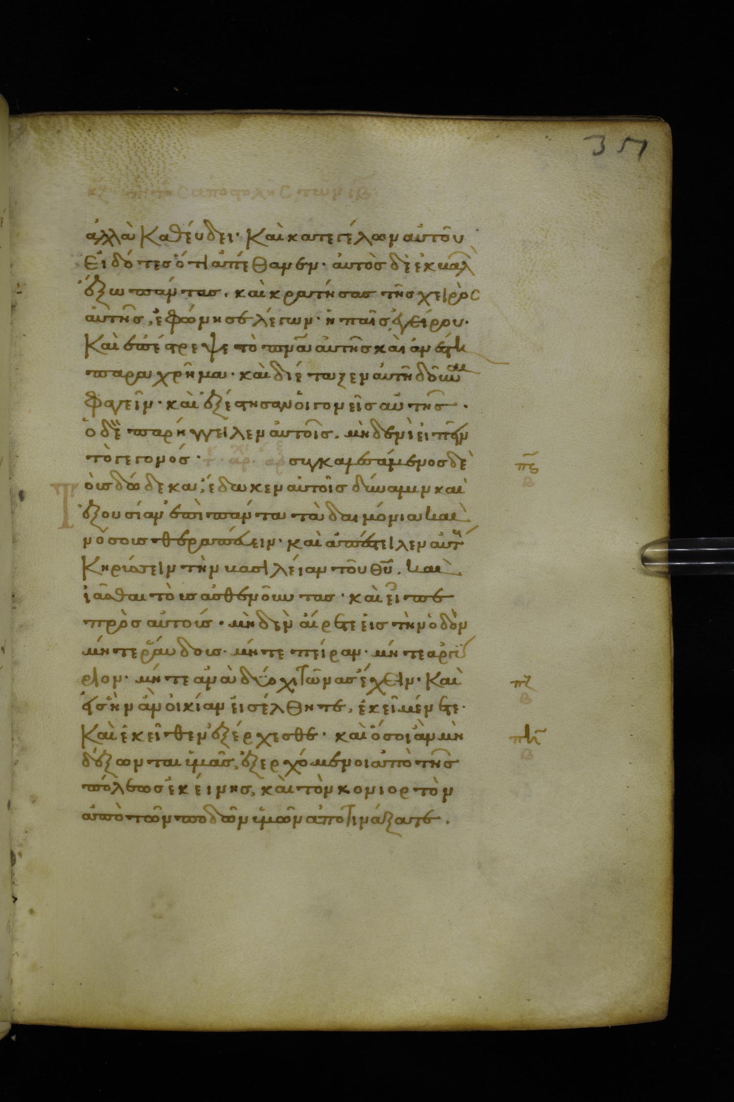 Fourteenth century minuscule of the Gospels on parchment; 282 leaves, 1 column, 22-23 lines per column. Images were taken at the National Library of Greece in Athens.
