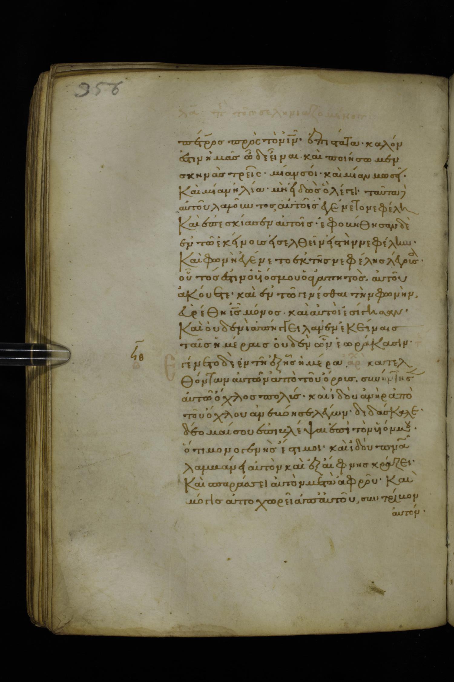 Fourteenth century minuscule of the Gospels on parchment; 282 leaves, 1 column, 22-23 lines per column. Images were taken at the National Library of Greece in Athens.