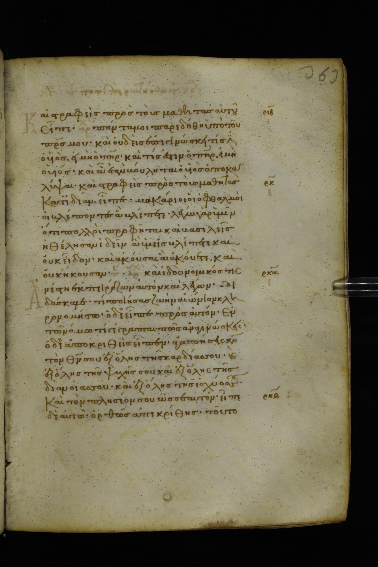 Fourteenth century minuscule of the Gospels on parchment; 282 leaves, 1 column, 22-23 lines per column. Images were taken at the National Library of Greece in Athens.