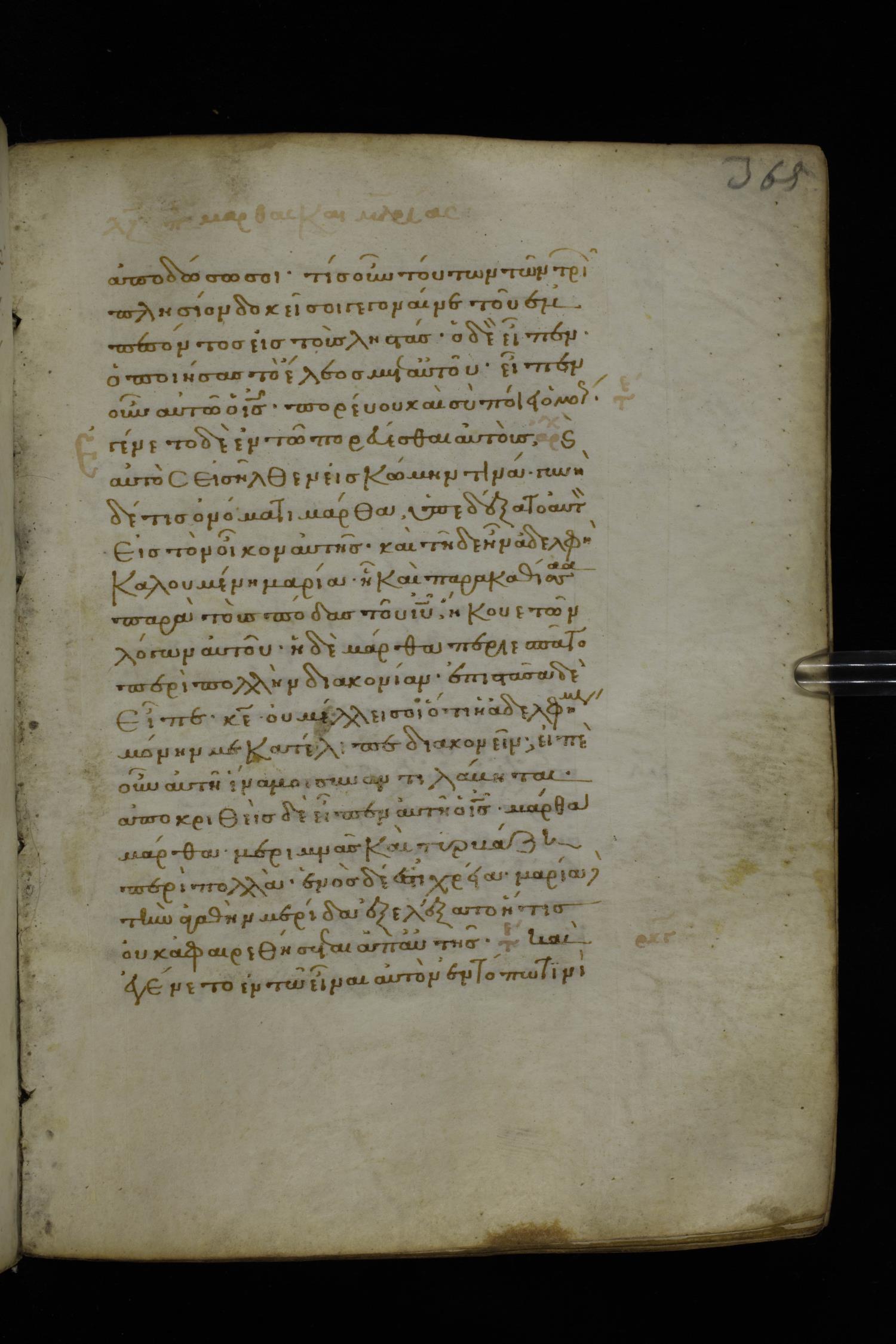 Fourteenth century minuscule of the Gospels on parchment; 282 leaves, 1 column, 22-23 lines per column. Images were taken at the National Library of Greece in Athens.