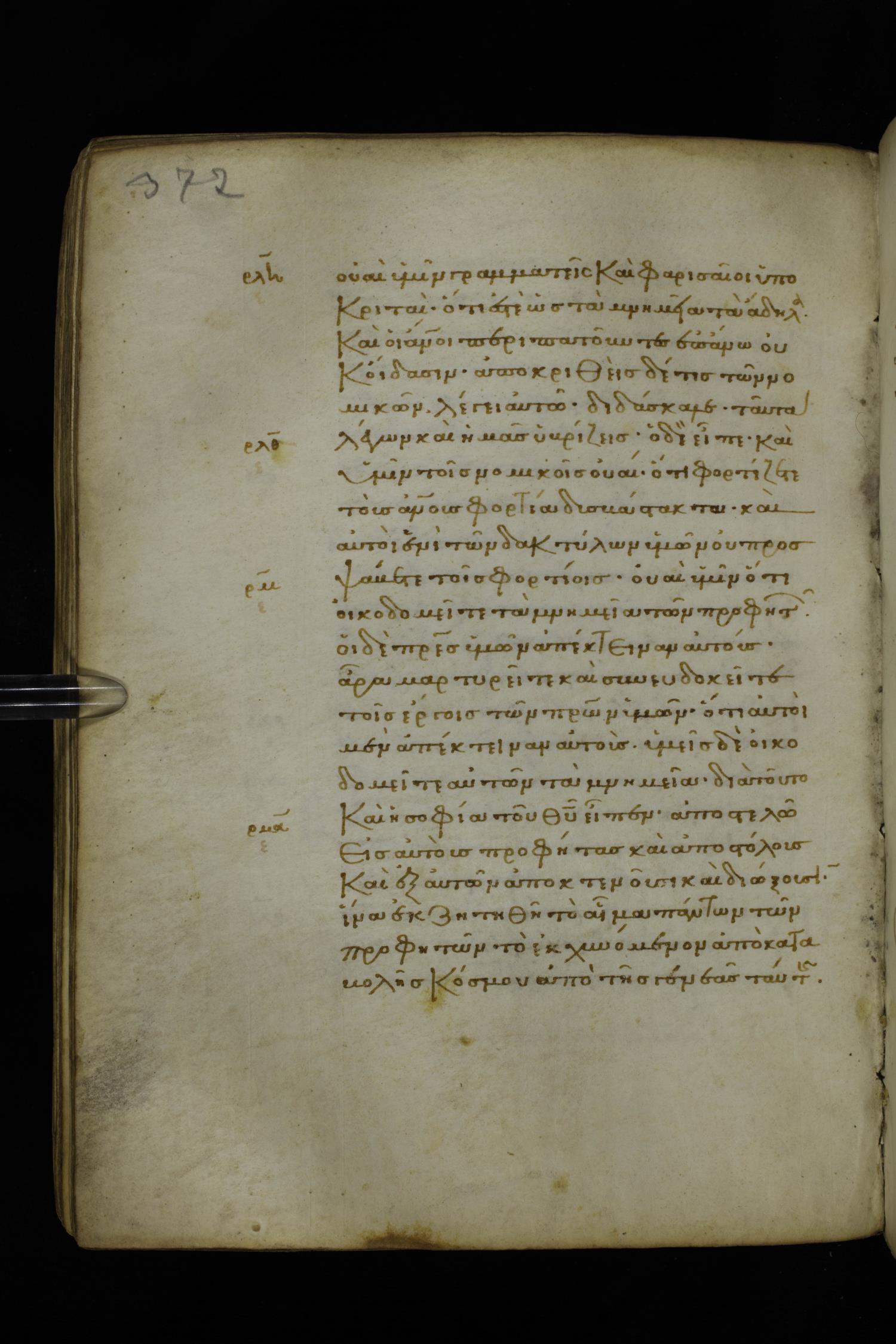 Fourteenth century minuscule of the Gospels on parchment; 282 leaves, 1 column, 22-23 lines per column. Images were taken at the National Library of Greece in Athens.