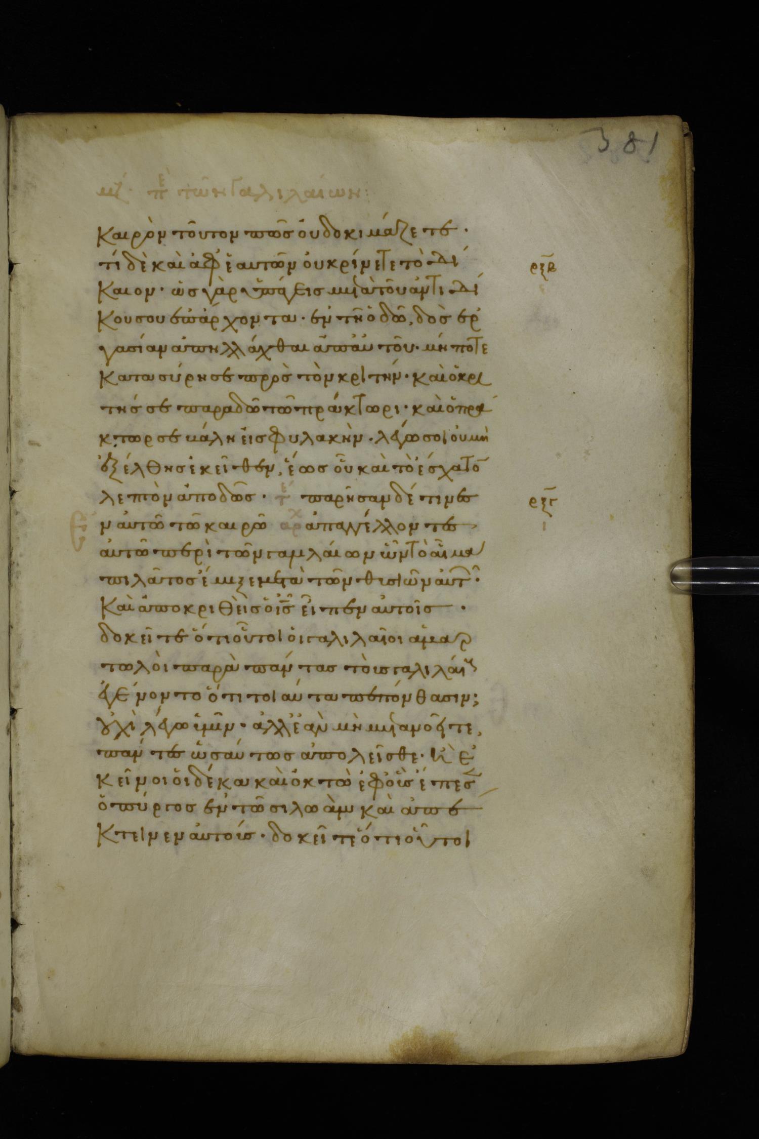 Fourteenth century minuscule of the Gospels on parchment; 282 leaves, 1 column, 22-23 lines per column. Images were taken at the National Library of Greece in Athens.