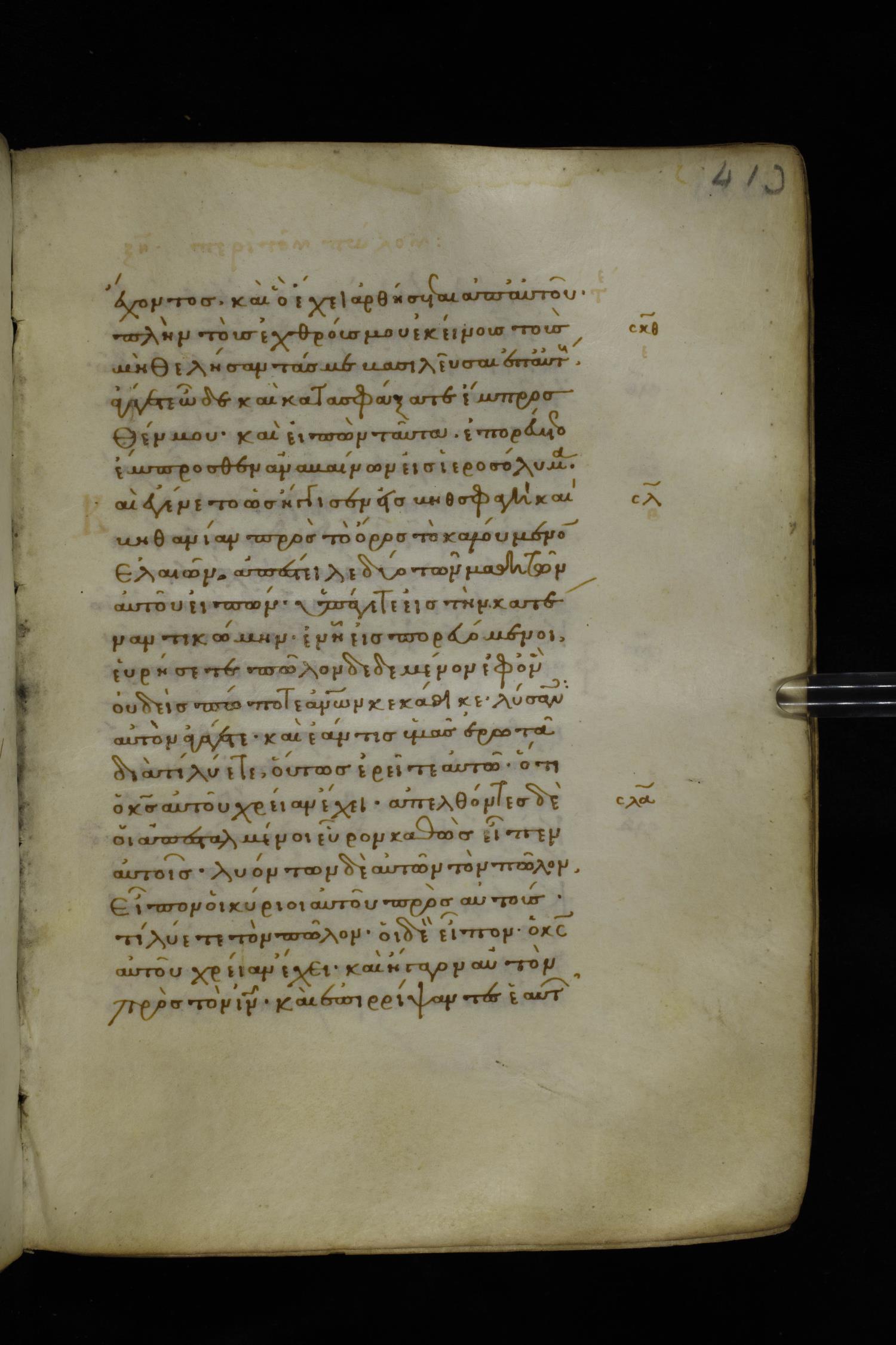 Fourteenth century minuscule of the Gospels on parchment; 282 leaves, 1 column, 22-23 lines per column. Images were taken at the National Library of Greece in Athens.