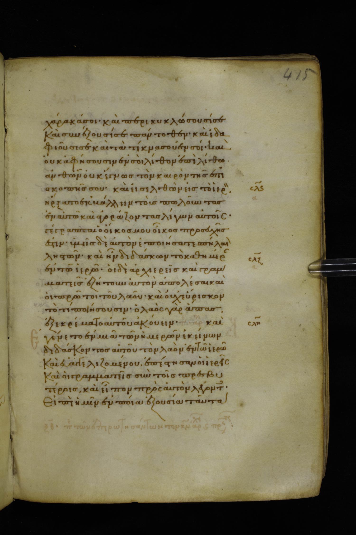 Fourteenth century minuscule of the Gospels on parchment; 282 leaves, 1 column, 22-23 lines per column. Images were taken at the National Library of Greece in Athens.